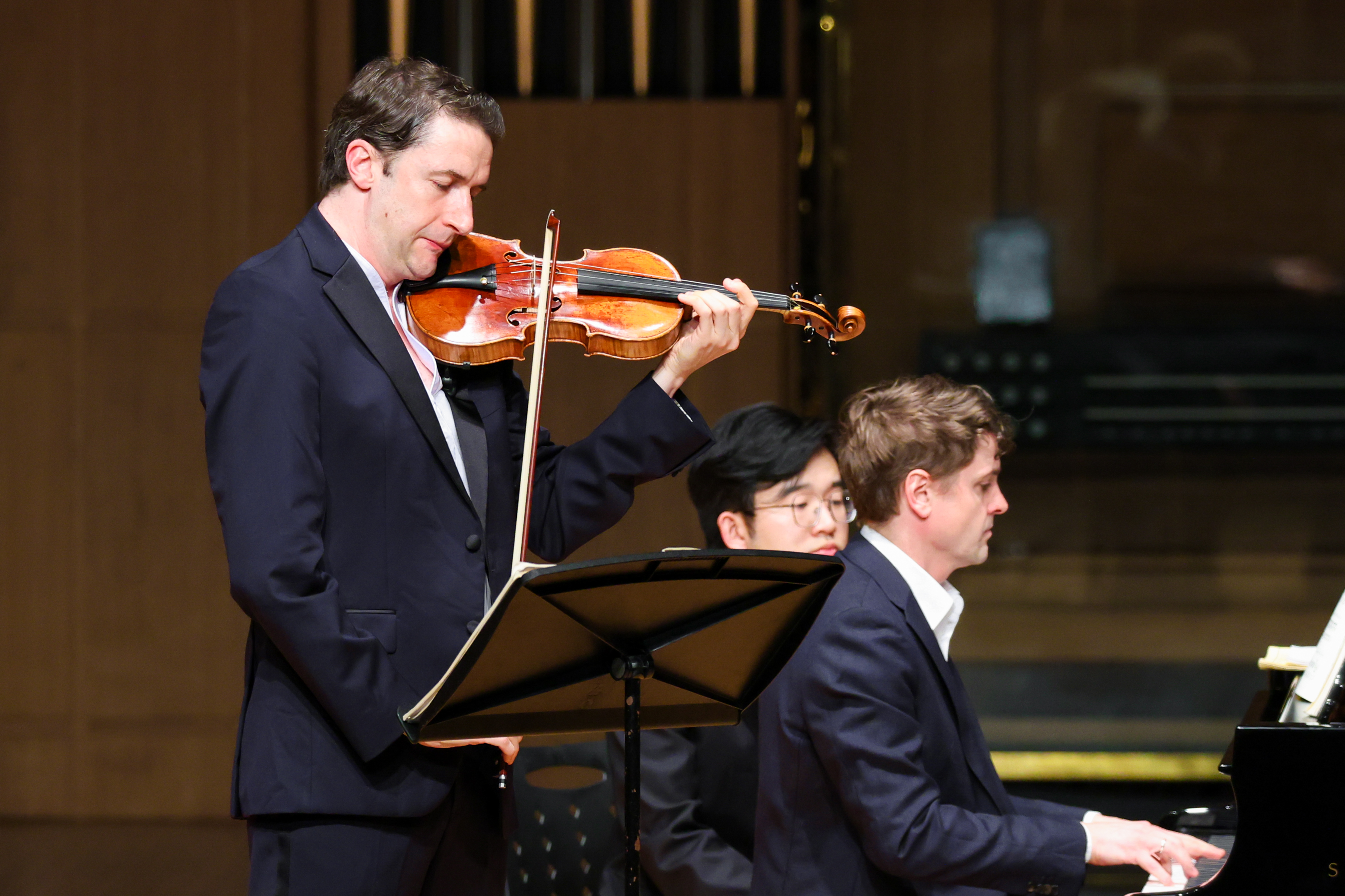5月6日晚,标准音乐厅座无虚席,两位艺术家为师生带来了一场令人难忘的音乐盛宴。整场音乐会持续两个半小时,上演了莫扎特的《G大调第十八小提琴与钢琴奏鸣曲》、科恩戈尔德的《无事生非》组曲(为小提琴与钢琴改编)、拉威尔的《G大调第二小提琴与钢琴奏鸣曲》、弗朗克的《A大调小提琴与钢琴奏鸣曲》以及由格什温作曲、海菲兹改编的《波吉与贝丝》选段。作品的编排,体现了从古典到现代、传统到流行爵士风格的交融,均完美地演绎并呈现给现场听众。