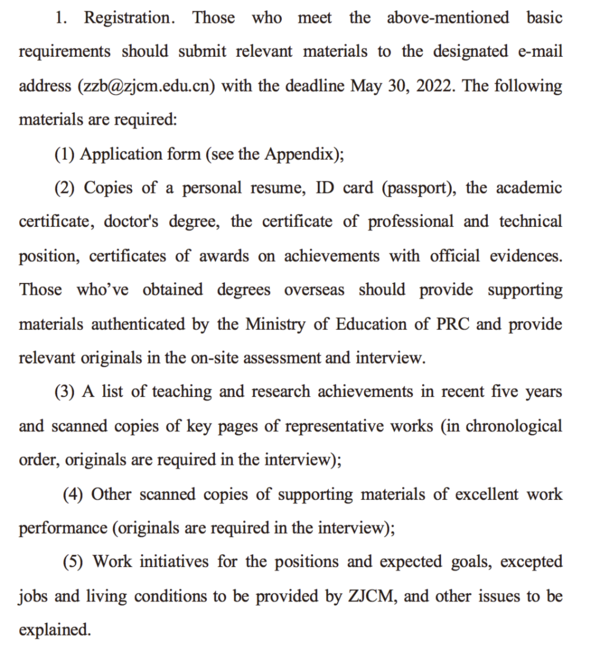 1.报名。符合应聘条件者,自公告发布之日起至2022年5月30日,报送相关材料发送到学校指定邮箱zzb@zjcm.zyy1696.com。需提供以下材料: