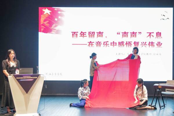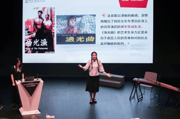 配合课程内容,讲座中采用助演形式,期间有古筝弹奏、歌剧《绣红旗》选段、《渔光曲》演唱、笛子吹奏。讲师声情并茂,通过问答的方式给与观众表达自我观点的机会,加深课程的印象,激发观众对音乐的浓厚兴趣。观众们凝神倾听,时而激愤,时而感动,小剧场内掌声不断。大家在音乐的鉴赏中更加深切体会到我党百年征程的艰难困苦,感慨幸福生活得来不易,音乐的无穷魅力,也进一步共情了我们人类追求自由、幸福生活的热切期望!