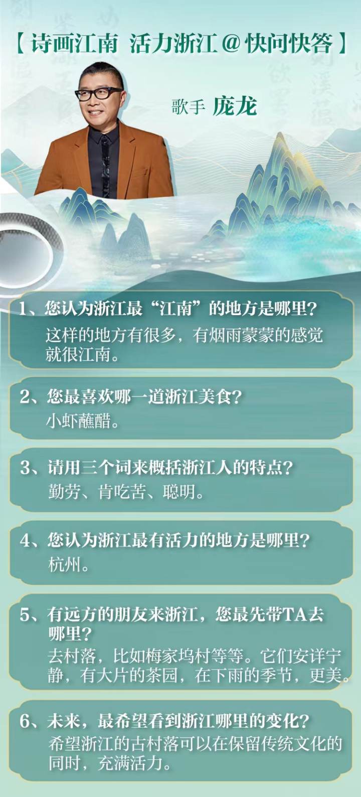 “要给浙江写歌的想法其实很早就有了,《来杭州》恰好契合目前‘诗画江南·活力浙江’这一浙江省域品牌主题词,是我运气好。”庞龙很谦虚。1998年,他就来过杭州,这里细雨朦胧中氤氲的青瓦屋脊,雾气中西湖边若隐若现的远山,是他心中的江南印象。