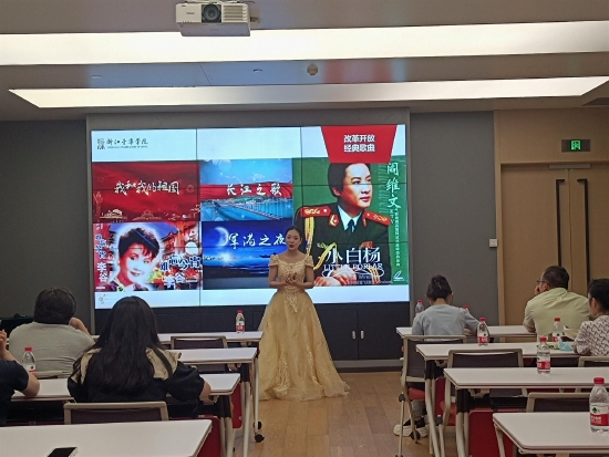 此外,浙音师生以红色音乐作品为主打,与地方优秀的理论宣讲员合作,形成具有地域特色的音乐党课。在余姚,师生配合余姚“舜江青语”理论宣讲联盟的青年宣讲员,慷慨激昂地奏响了《第一交响序曲》;在临平,师生与“新时代临平青年说”宣讲团合作《爱在吴越山水之间》等3部精彩的宣讲作品,博得观众的阵阵叫好声。