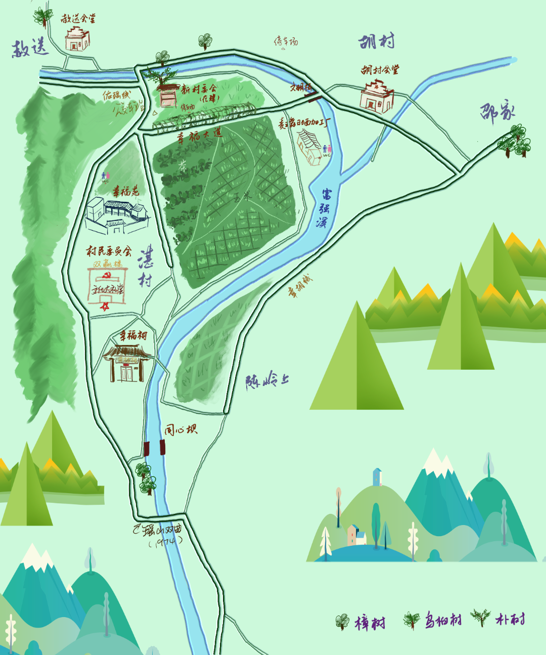 实践团成员们走访并绘制了独属于幸福村的旅游路线图,将生活服务区、自然景观内容、人文传统元素缩略在一张图上,帮助游客们更便捷地游览幸福村、感受古朴乡风。