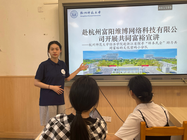 “今天,我想和大家分享传化集团助力浙江省建设‘共同富裕‘美好社会的实践……”7月20日,在杭州富阳维博网络科技有限公司的会议室里,来自杭州师范大学经济学院金融专业的宣讲员柯颖,分享了自己的亲身实践经历。