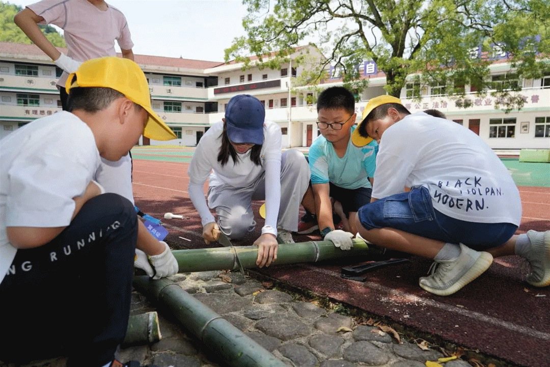 支教第一天,恰逢来自杭州市临平区的32名学生开展“山海架桥相约七里”暑期夏令营活动。周李萍、王毓和叶英3位支教老师马上参与到课程活动当中,指导学生锯竹、破竹、做竹筒饭。伴随着孩子们真挚的笑容,师生情在课堂中逐渐升温。