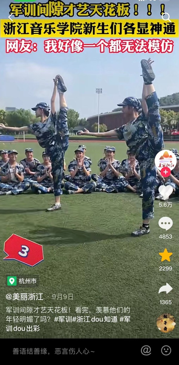 新闻来源:复制打开:/ 抖音,看看【美丽浙江的作品】军训间隙才艺天花板!看完,羡慕他们的年轻明媚了吗?... ΨΨeOcEub7mQ3ONv8▽▽ (复制链接,打开抖音观看)