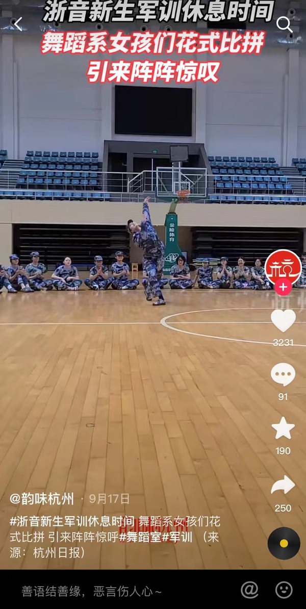 韵味杭州:浙音新生军训休息时间 舞蹈系女孩们花式比拼 引来阵阵惊叹