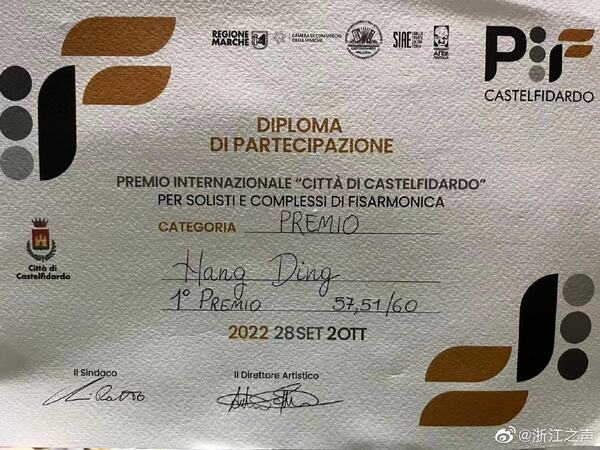 PIF曾被国家文化和旅游部列为手风琴界三大权威赛事之一。该赛事的“艺术家组”设有三轮评比,丁航一路过关斩将,最后斩获冠军,赢得了乐队指挥与各国评委的一致好评。祝贺丁航同学!(浙江之声记者解梓笛,通讯员孟欣)