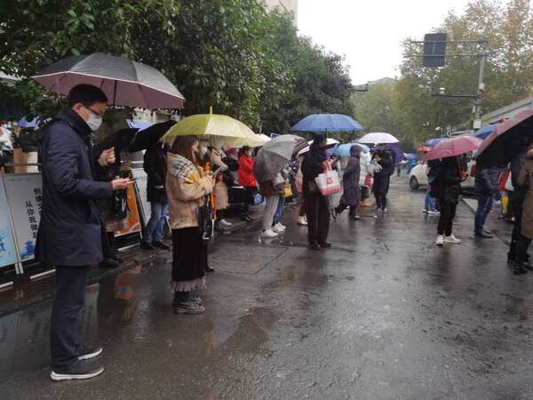 12月3日11时许,考试结束的铃声还未响起,杭州市美术职业学校(莫干校区)考点外,已经有许多家长围着大门等候。有些家长互相认识,谈笑着说,“我们丁兰街道的孩子是不是都在这里考?”有些家长则向过来推销的艺考辅导机构的人员,讲诉自己的的担忧。但大部分家长,还是在伞下沉默地等待着。