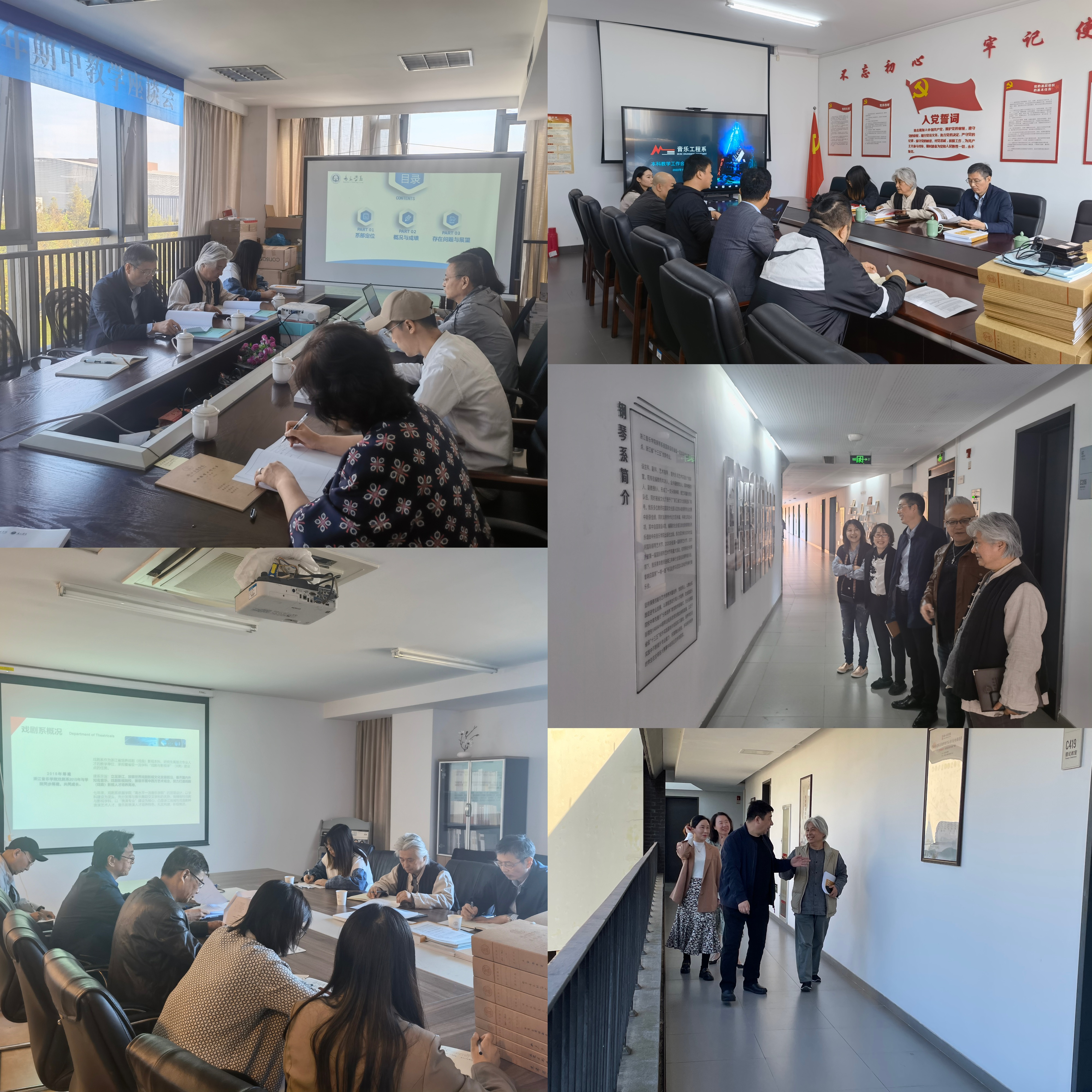 走访过程中,杨九华参观了各教学单位的文化墙布置,翻阅相关材料,听取本科教学工作汇报。他充分肯定了各教学单位前期迎评准备工作,表示各单位高度重视、齐心协力,充分发挥主观能动性,使各单位环境焕然一新。同时,他还提出了再提高、再打磨、再强调的要求,并要求各单位在展示教学成果实物时,要增加实物的品类和数量,传递既丰富又有序的视觉感受;汇报时需进一步凝练特色,体现辨识度高的办学理念和成果,增加演出视频等动态素材;要加强对教风学风的管理,确保教学工作有序稳定。