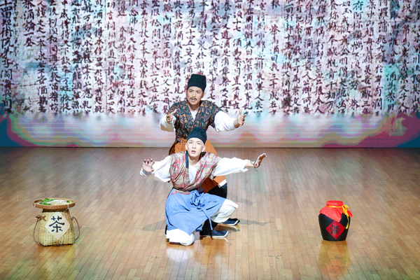 《茶酒论》是《中国戏曲志·甘肃卷》中收录的敦煌文献遗存,根据抄录流传下来最完整的版本来看,其创作于晚唐时期,出自晚唐乡贡进士王敷之笔。原文献内容通过拟人化的“茶”与“酒”的论争,反映了不同阶层人群的生活态度,最后通过“水”的调解,制止了两者的争论,并告诉他们,没有水,他们都不能成其所以然,所谓万物和谐共生,从而化解了双方的矛盾,表达了作者追求“以和为贵”的政治理念。原文本的内容结构、人物关系和故事情节相对完备,给后人留下了广阔的创作空间。本剧便是在原文献《茶酒论》的基础之上研习创作,剧本从文献的写成背后、流传背后、现代呈现三点一脉的视角切入,并展开想象,在探索敦煌文献《茶酒论》前世今生的同时,挖掘展现其背后的故事。全剧分为两幕(上下两阙),第一幕主以现代读献者与晚唐作者王敷、北宋抄录者小和尚的对话,来展现王敷创作《茶酒论》的情怀背景与抄录保护敦煌古文献的流传历程,为引出正戏《茶酒论》作为铺垫。第二幕主要对是原文献《茶酒论》的创作解读与舞台重现。在创演的过程中,演员的表演状态、形体动作、音乐风格等都力求靠近唐代歌舞戏的朴拙感,在表达原文献核心思想的同时,将唐代“戏弄”表演风格展现在观众面前,实现文献内容与舞台形象、核心思想与人物情感的有机融合,发挥它本身的艺术价值与文化价值之外,也展现它超越时代的社会价值。