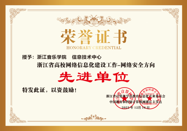 近日,浙江省计算机学会教育信息化专业委员会、中国教育和科研计算机网浙江省主节点联合评审出2022年浙江高校网络信息化建设先进单位和先进个人,学院艺术处、招生办公室分别荣获浙江省高校网络信息化建设工作先进单位-数字化改革方向,信息技术中心荣获浙江省高校网络信息化建设工作先进单位-网络安全方向。姚逸仙同志被评为浙江省高校网络信息化建设工作先进个人。