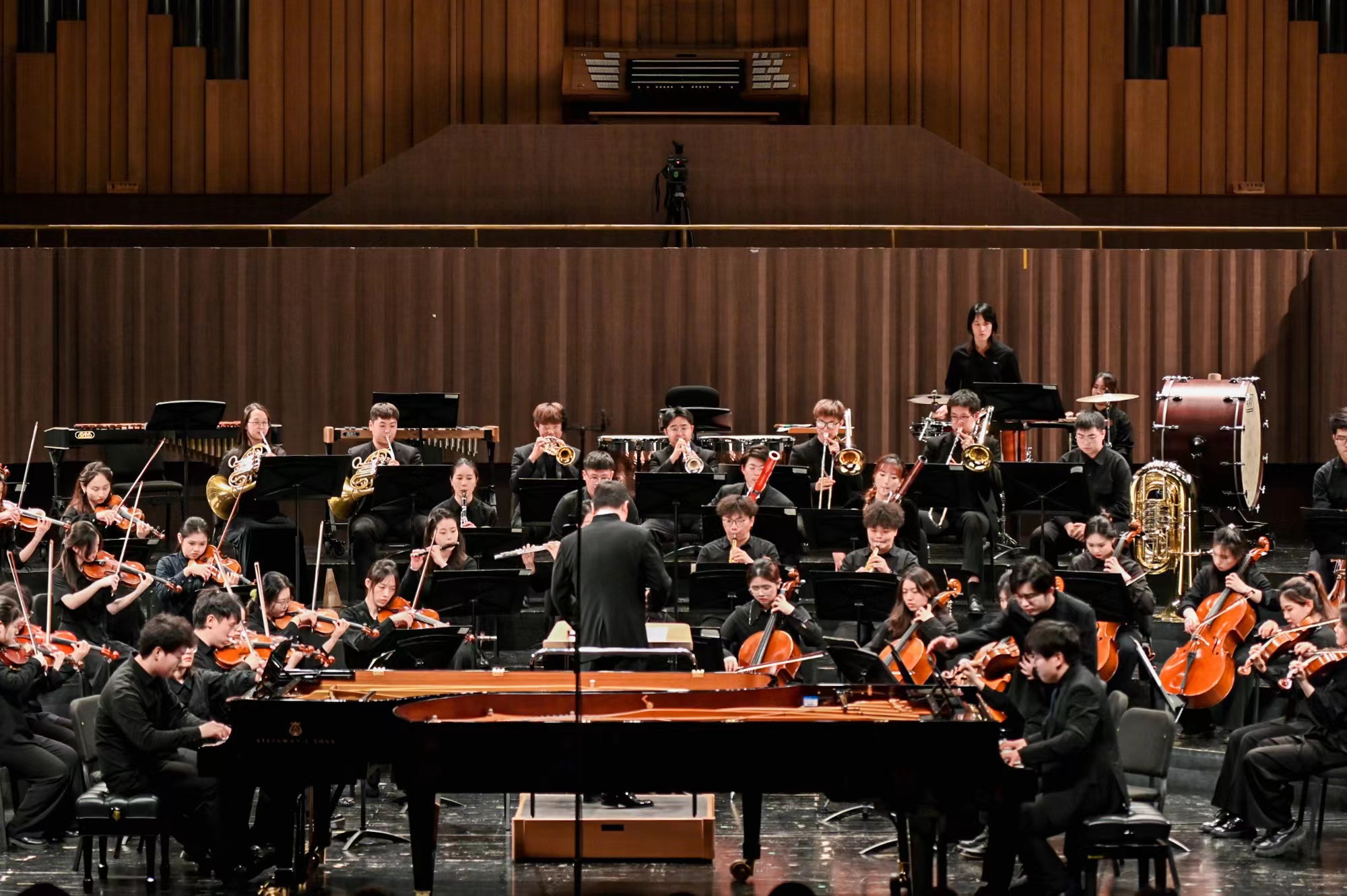 首先,乐团带来了著名作曲家舒伯特的《b小调第八交响曲》(“未完成”1822),正式拉开音乐会帷幕。随后乐团与两位钢琴系的优秀学生陈维祯、宗敬博共同诠释了普朗克的《d小调双钢琴协奏曲》,双钢琴与交响乐交相辉映,给听众带来独特的法国风情。音乐会最后一曲是形象丰富的《动物狂欢节》组曲,栩栩如生的演奏,令听众仿佛置身其中。