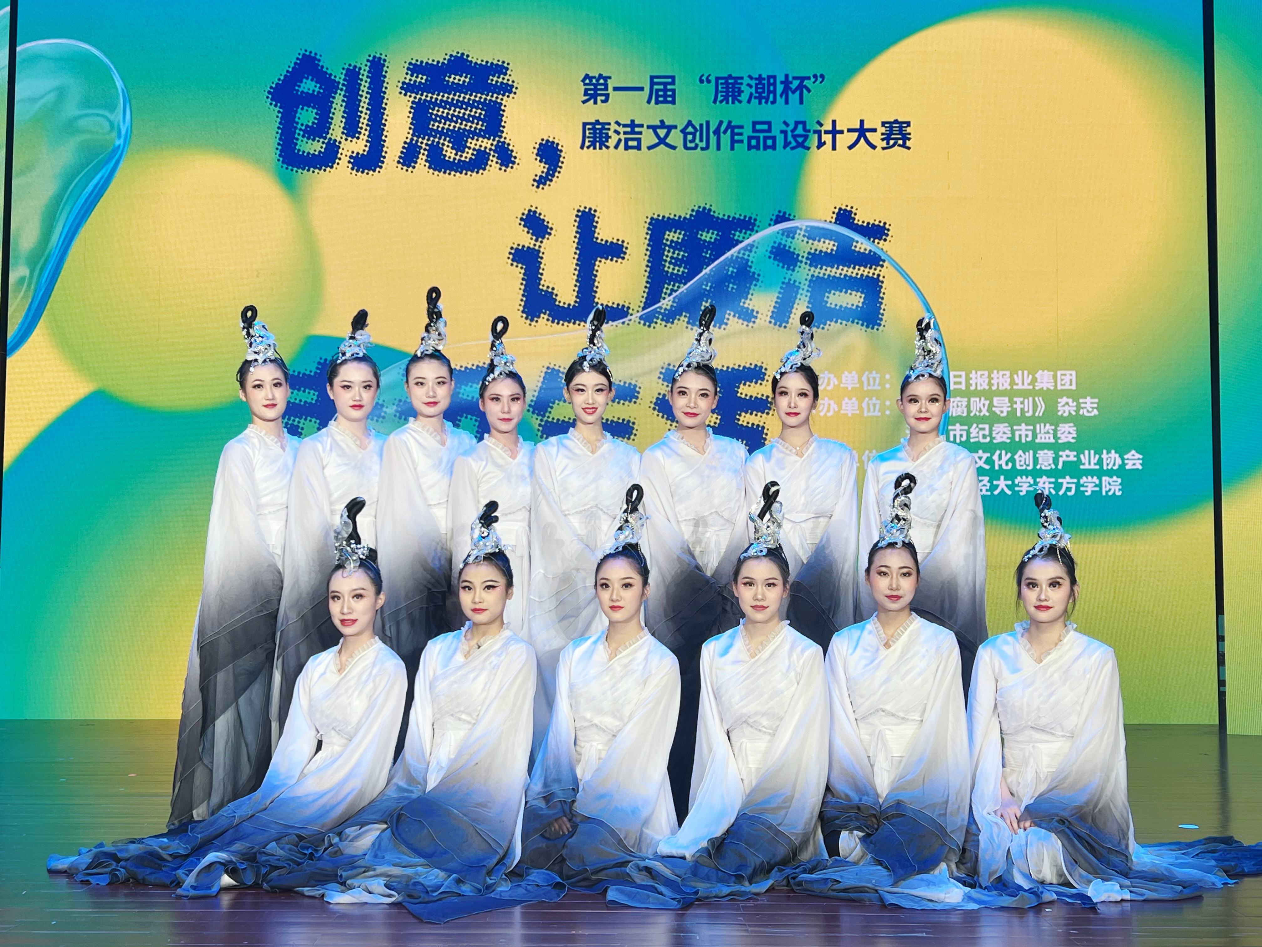 近日,为充分发挥廉洁文化浸润作用,传承弘扬优秀传统文化,推动廉洁文化和文创作品深度融合,浙江省首届“廉潮杯”廉洁创作品设计大赛颁奖典礼在嘉兴海宁举行,由学院古典舞教研室青年教师李秋竹领舞,舞表191班学生参演的舞蹈作品《白纻舞·在水一方》受邀至现场演出。