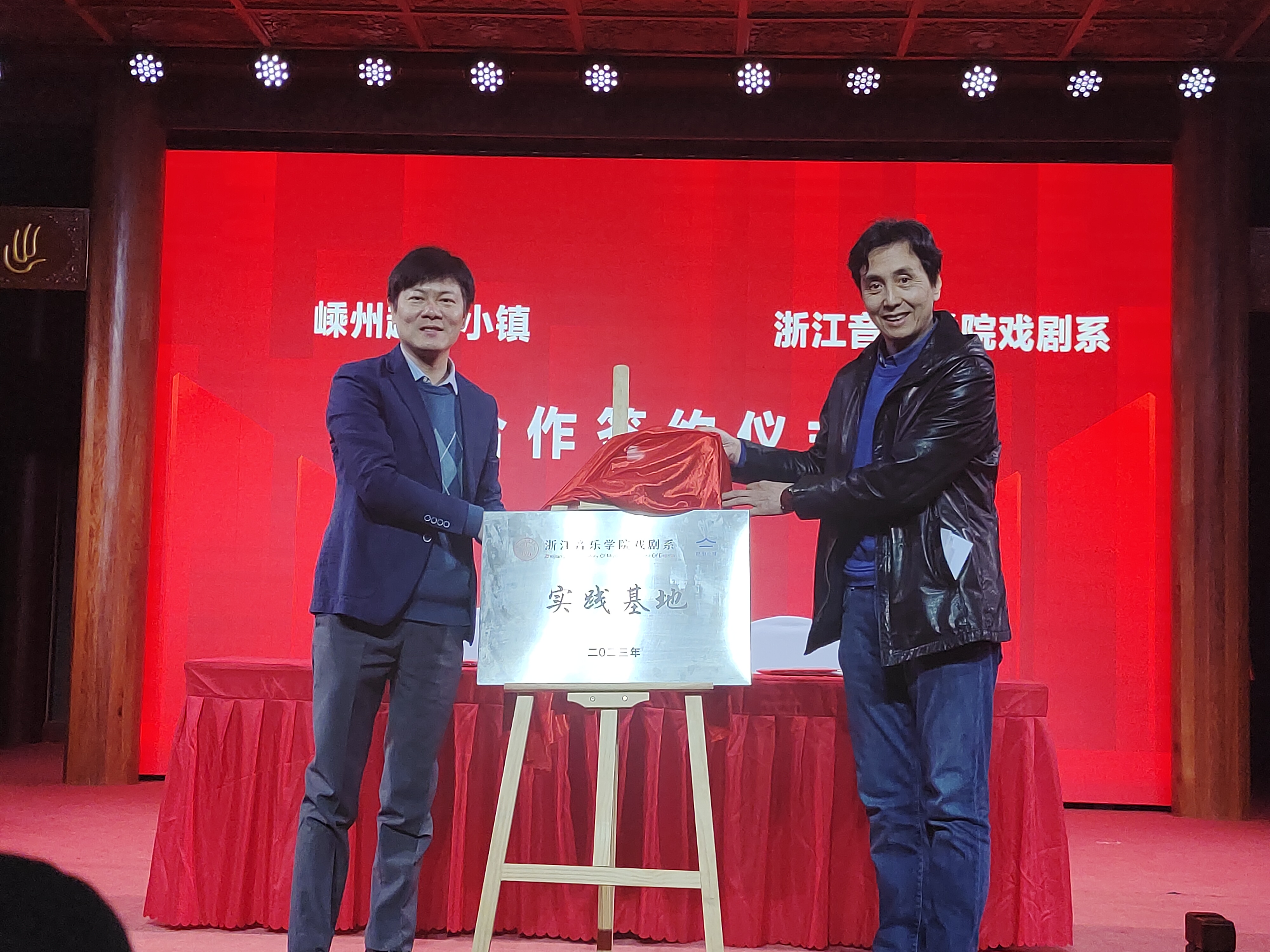 近日,戏剧系与浙江嵊州越剧小镇共建实践基地的签约授牌仪式在顺利举行。戏剧系总支书记、副主任安怡一行,嵊州市文化广电旅游局党委委员、副局长施棋明,以及越剧小镇总经理杨岳、嵊州越剧艺术学校相关负责人参加。安怡和杨岳签订了共建实践基地协议并为基地授牌。