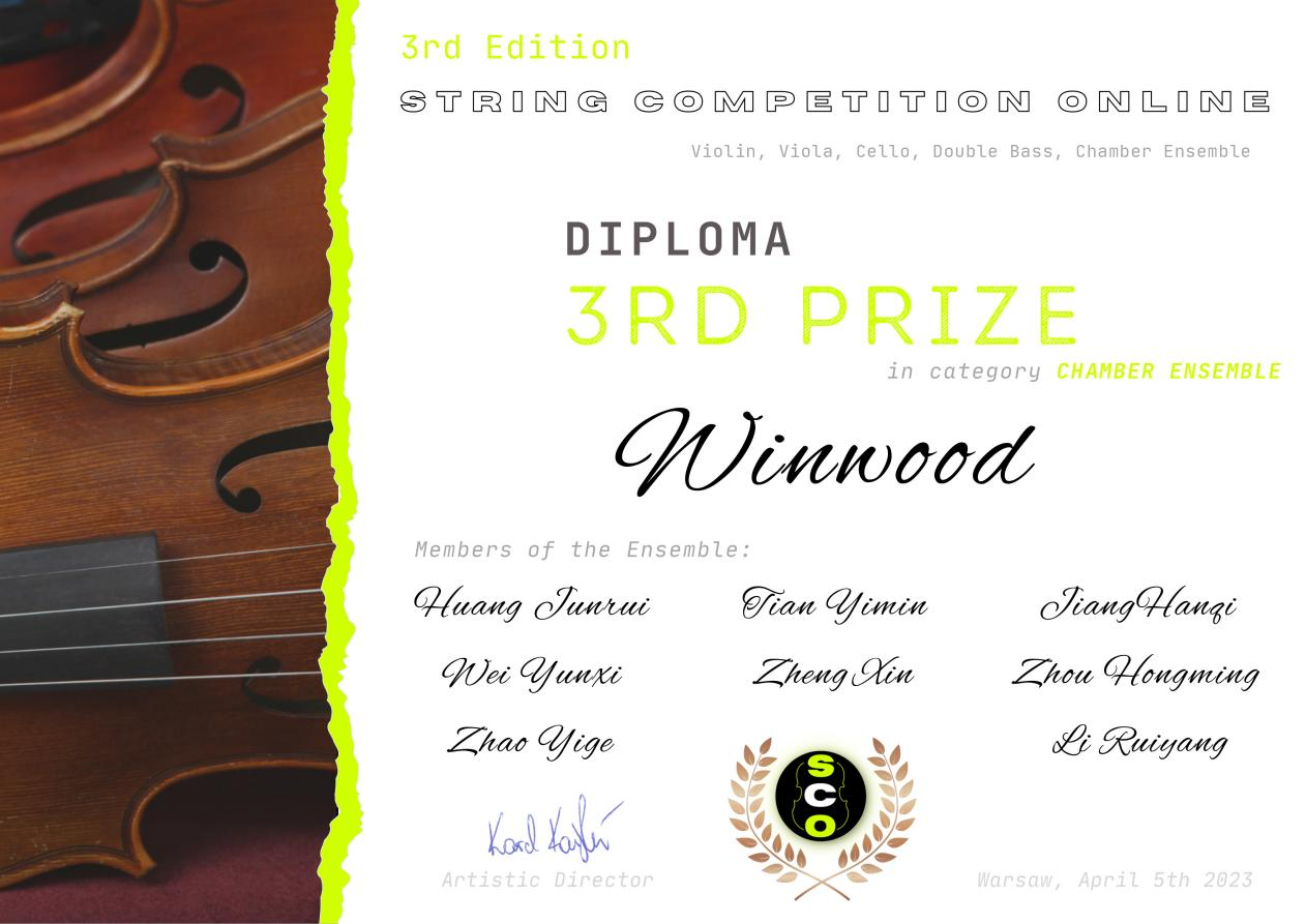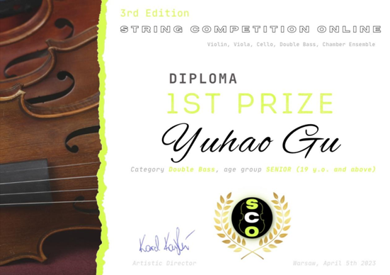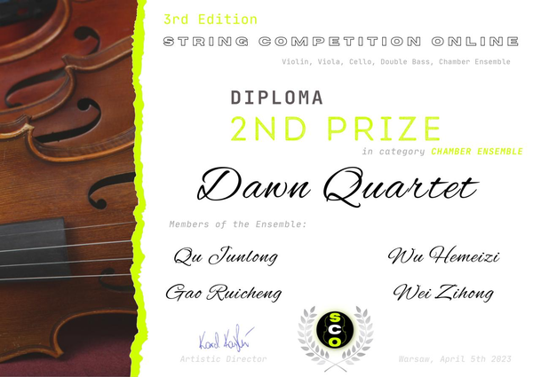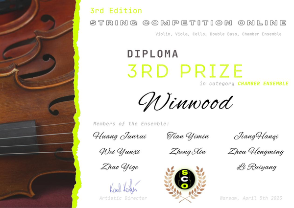 4月5日,在SCO Organizing Committee线上弦乐比赛(波兰弦乐和室内乐国际音乐大赛)中,管弦系、室内乐学院学生顾宇豪荣获低音提琴独奏组一等奖(指导老师:黄琛);曲俊龙、高瑞铖、吴何玫子、魏子闳组成的“Dawn Quartet”钢琴四重奏荣获室内乐组二等奖(指导老师:史佳怡);田益民、黄俊睿、姜涵琪、魏秐西、郑欣、周鸿铭、赵艺格、李瑞阳组成的“Winwood”管乐八重奏荣获室内乐组三等奖(指导老师:李佳胤);附属音乐学校中提琴专业初一学生丁冠贺荣获中提琴组别一等奖(指导老师:刘瓅元,艺术指导教师:史佳怡、高晨醒)。
