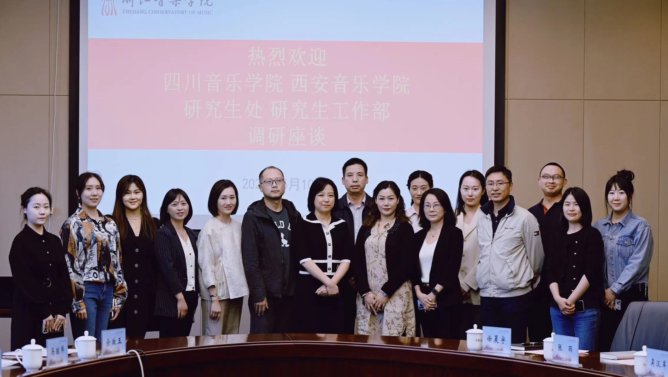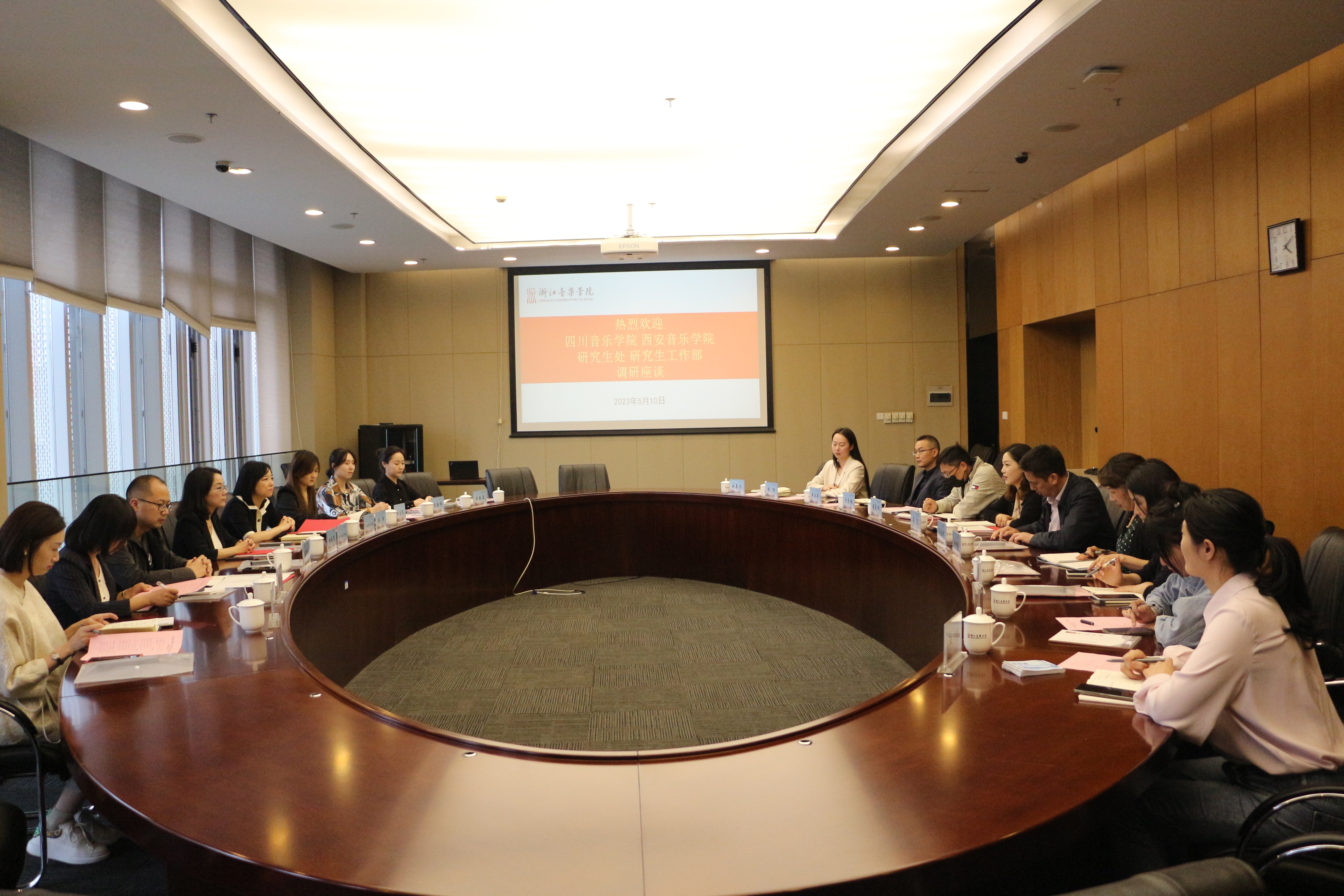 5月10日,四川音乐学院研究生处处长杨晓琴、副处长陈国威一行4人,西安音乐学院研究生部党总支副书记、研究生部(学科建设办公室)副主任陈卉一行5人来访,与我校发展规划处、科研处、研究生工作部、研究生处进行了深入的交流座谈。