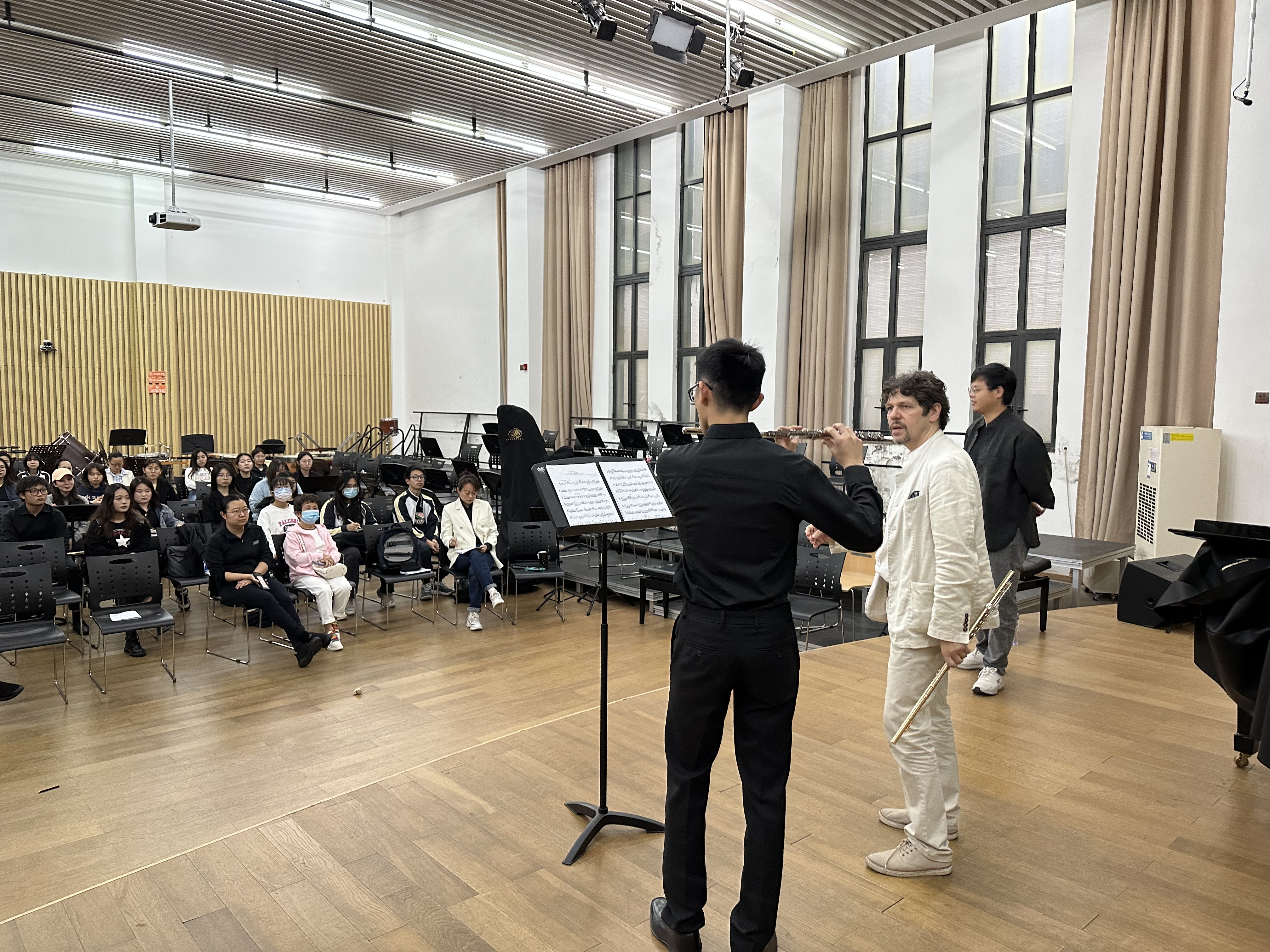 盖尔盖伊教授以长笛演奏的无限可能性为题,为同学们讲授了一堂内容丰富、干货满满的大师班。大师班上,管弦系多位学生演奏了巴赫的《奏鸣曲》、舒伯特的《美丽的磨房女主题变奏曲》、若里维的《奏鸣曲》等作品。盖尔盖伊教授亲自示范,对演奏中和弦的构想、吐音与音质变化,以及最根本的呼吸原理等问题做了细致精彩的讲解。他热情慷慨地解答了同学们的问题,让在场师生受益匪浅。