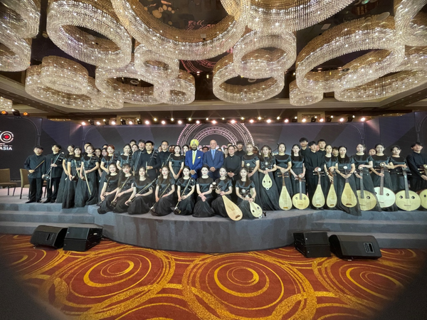 在我院师生的共同努力下,近一个小时的演出活动,现场气氛热烈而温馨。学院师生精彩演绎了《春江花月夜》《丝绸之路》《渔舟唱晚》《西湖漫步》等富含中华文化底蕴和浙江文化特色的经典曲目,特别是由王甫建教授为此次演出专门编曲的《亚洲各国名曲连奏》,用中国传统民族器乐演奏出异国风情,让国际友人耳目一新,产生深切的情感共鸣。正值中秋佳节来临之际,终曲《花好月圆》表达了浙音师生以艺术为媒介,对各国友人欢聚一堂、共襄盛世的美好期许。演出结束后,亚奥理事会代理主席辛格等领导上台与师生合影,并表示深深的赞许和感谢。
