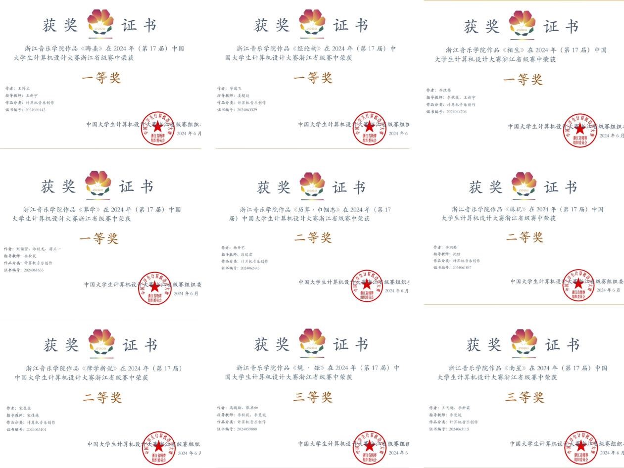 近日,2024年(第17届)中国大学生计算机设计大赛浙江省级赛落下帷幕,音乐工程系多位学生作品在此次比赛中获得佳绩。其中王博文的《晦熹》(指导老师:王新宇)、毕逸飞的《经纶韵》(指导老师:姜超迁)、乔汉英的《相生》(指导老师:李秋筱、王新宇)、刘储贤、冷校龙、蒋正一的合作作品《算学》(指导老师:李秋筱)获计算机音乐创作类一等奖;李玥慜的《珠玑》(指导老师:沈佶)、杨丹艺的《历算·巾帼志》(指导老师:段瑞雷)、宋盈盈的《律学新说》(指导老师:宋佳林)获计算机音乐创作类二等奖;王弋飏、李祈霖的合作作品《南星》(指导老师:李曼妮)、高鹏翔、张卓伽的合作作品《规·矩》(指导老师:李秋筱、李曼妮)获计算机音乐创作类三等奖。