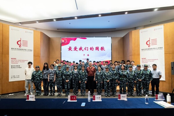 在主题教育的最后,现场的每一位师生全体起立,再一次怀揣着共同的爱国情感,高亢地唱响了我们的国歌——《义勇军进行曲》。军训期间,管弦系结合国家艺术基金——《管乐艺术表演及评论人才培训》、第7届国际室内乐音乐节等活动,为学生开展形式丰富多样的教育活动、艺术活动,加强新生思想政治教育,增强学生爱国主义情感和获得感。