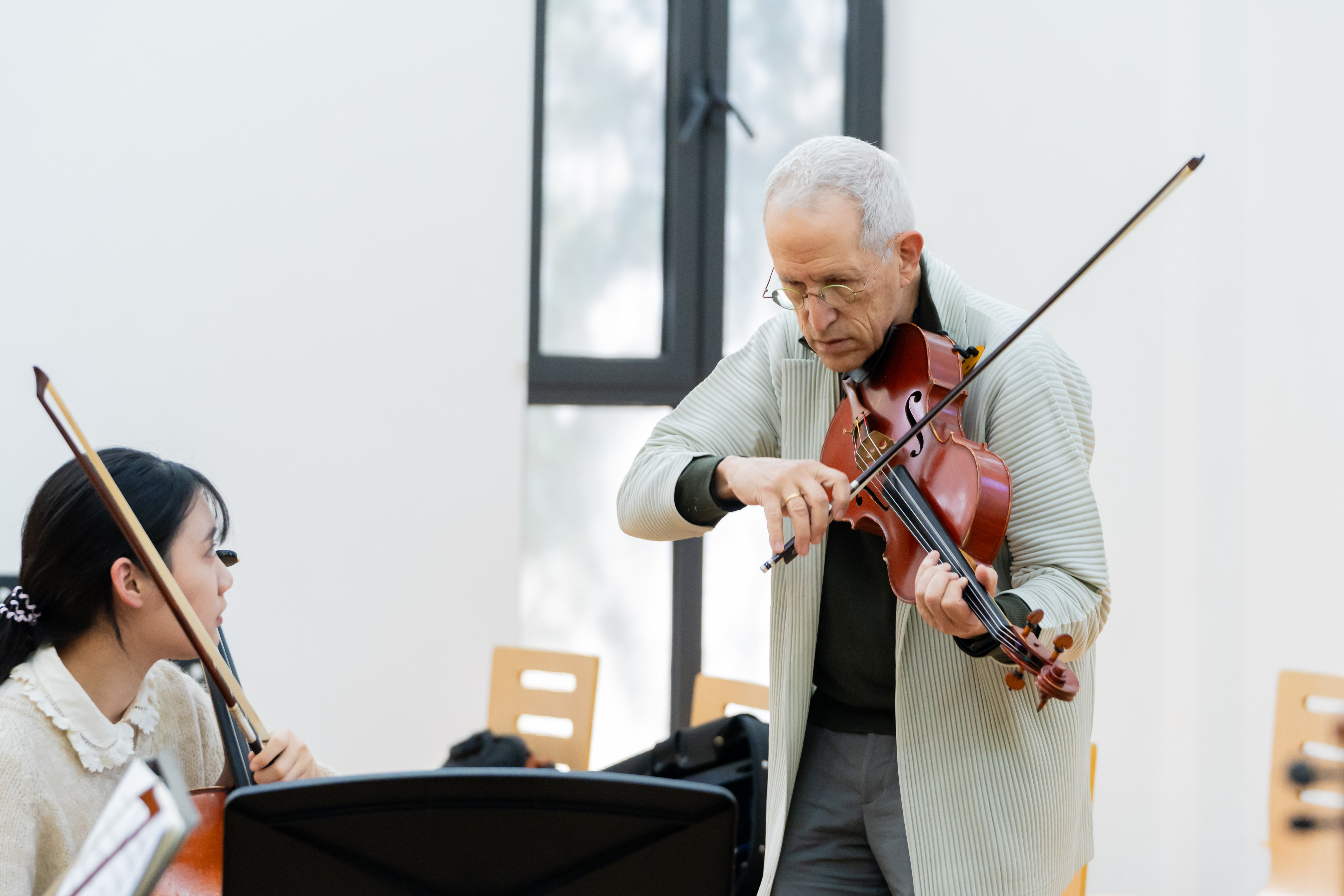 在大师班上,特南博姆先生在对乐曲剖析的过程中,始终立足于对音乐结构、主题发展及整体布局的深刻洞察,其分析构建在严谨的音乐理论之上。他具有敏锐的洞察力,能够精确把握作曲家的创作初衷与内在动因。在探讨音乐作品的内涵时,来自管弦系与室内乐学院的优秀学子再现了巴赫、莫扎特、勃拉姆斯和欣德米特等作曲大师的中提琴佳构,并以其独特的视角传达作品中的情感深度和哲学意蕴。在此过程中,特南博姆着重强调了音乐结构分析的精确性,以及对弓法和力度选择的精细考量。他的演奏哲学不仅在于追求音色的透明和旋律的连贯,更在于如何在丰富的音响层次中发掘音乐的核心动力。即使是面对诸如帕格尼尼与欣德米特的技巧巅峰,特南博姆依然坚守音乐传达的核心,深刻挖掘演奏的多维复杂性和创造性。