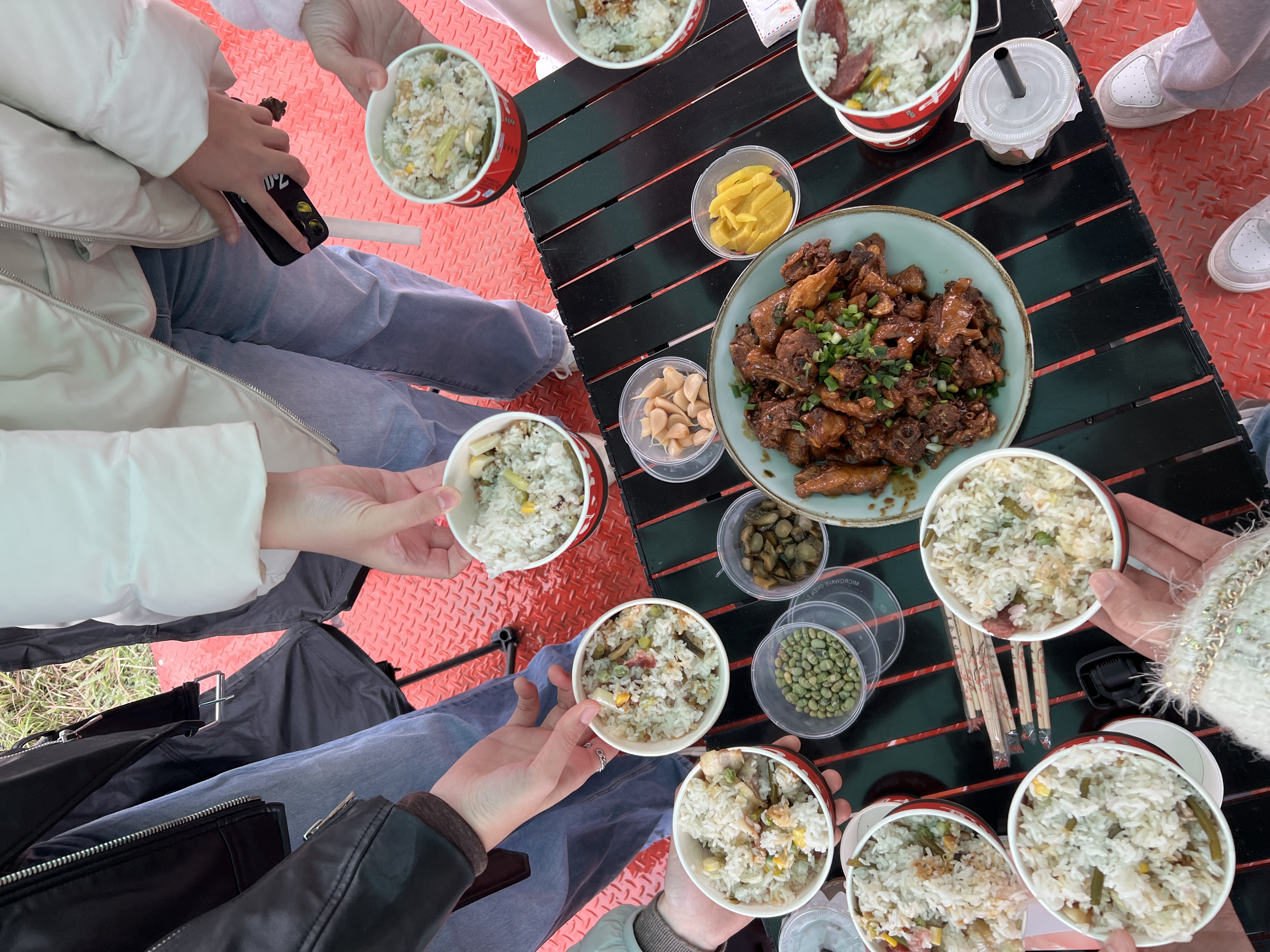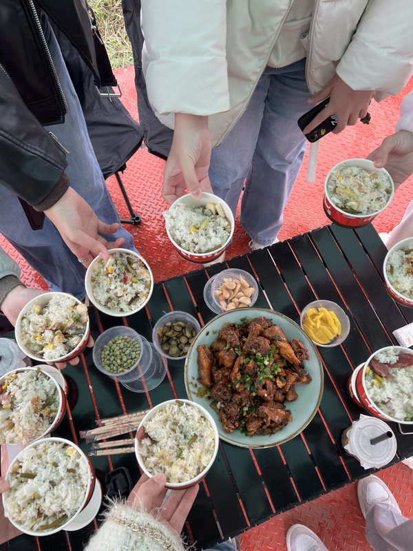 雪水港村的百亩油菜花正值盛放期,金黄花海与江南村落相映成趣。师生们漫步田间,用镜头记录春日胜景,通过摄影、短视频等方式在社交平台推介乡村风貌,以实际行动为乡村旅游“引流”。中午,师生们参与当地传统“田间野米饭”活动,与村民协作完成拾柴、生火、烹饪等环节。炊烟袅袅中,师生围坐田埂品尝农家风味,体验农耕文化的质朴魅力。活动不仅拉近了高校学子与乡村的距离,更让年轻一代在劳动中体悟“一粥一饭来之不易”的深意。