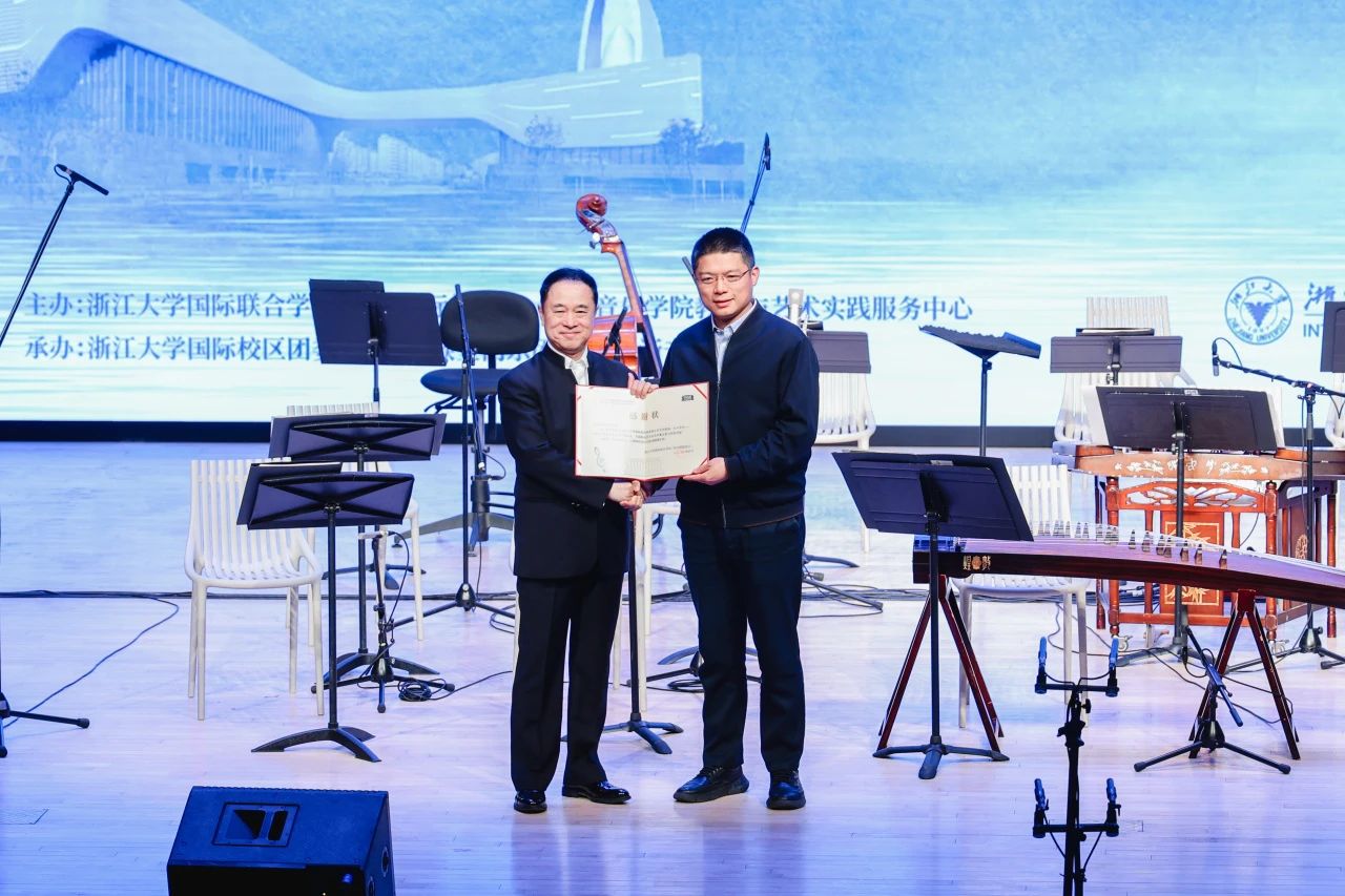 音乐会前,浙大国际联合学院(海宁国际校区)副院长陈良为乐团颁发了感谢状。并在经典古曲《春江花月夜》,拉开了音乐会的序幕。优雅的旋律如江水般流淌,唤起了观众对自然的无限遐想。