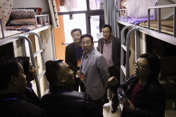 随后,代表一行分成六组,视察了三幢学生公寓,随机进入学生寝室,检查了学生寝室的卫生,并视察了公寓配套服务设施及公共活动空间,代表们对学生宿舍的设施条件及卫生状况予以了较高的评价,认为学生寝室卫生整洁,而且学生寝室的布置很有特色,充满青春活力。