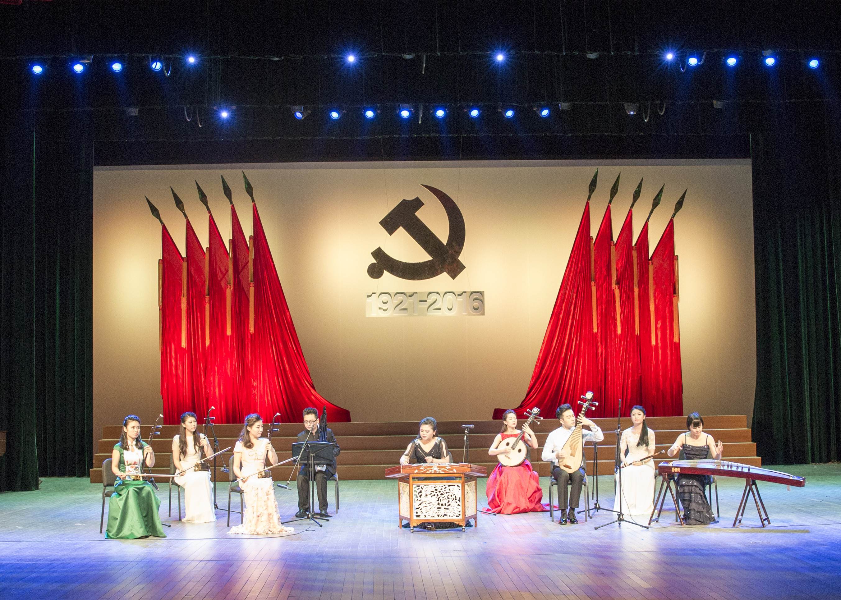 红歌阵阵颂美德,师生同台演经典。演出在国乐系党员师生张咏音、李跞等的民乐合奏《丝路新语》中拉开序幕,这是一首为“一带一路”而创作的民乐作品,以古丝绸之路为乐思,表达对这一曾承载着中西方文明交流历史,赋予崭新的时代内涵。二胡、扬琴、琵琶等民族乐器齐声合奏,浓浓的异域风情尽显出丝路文化的神秘感。
