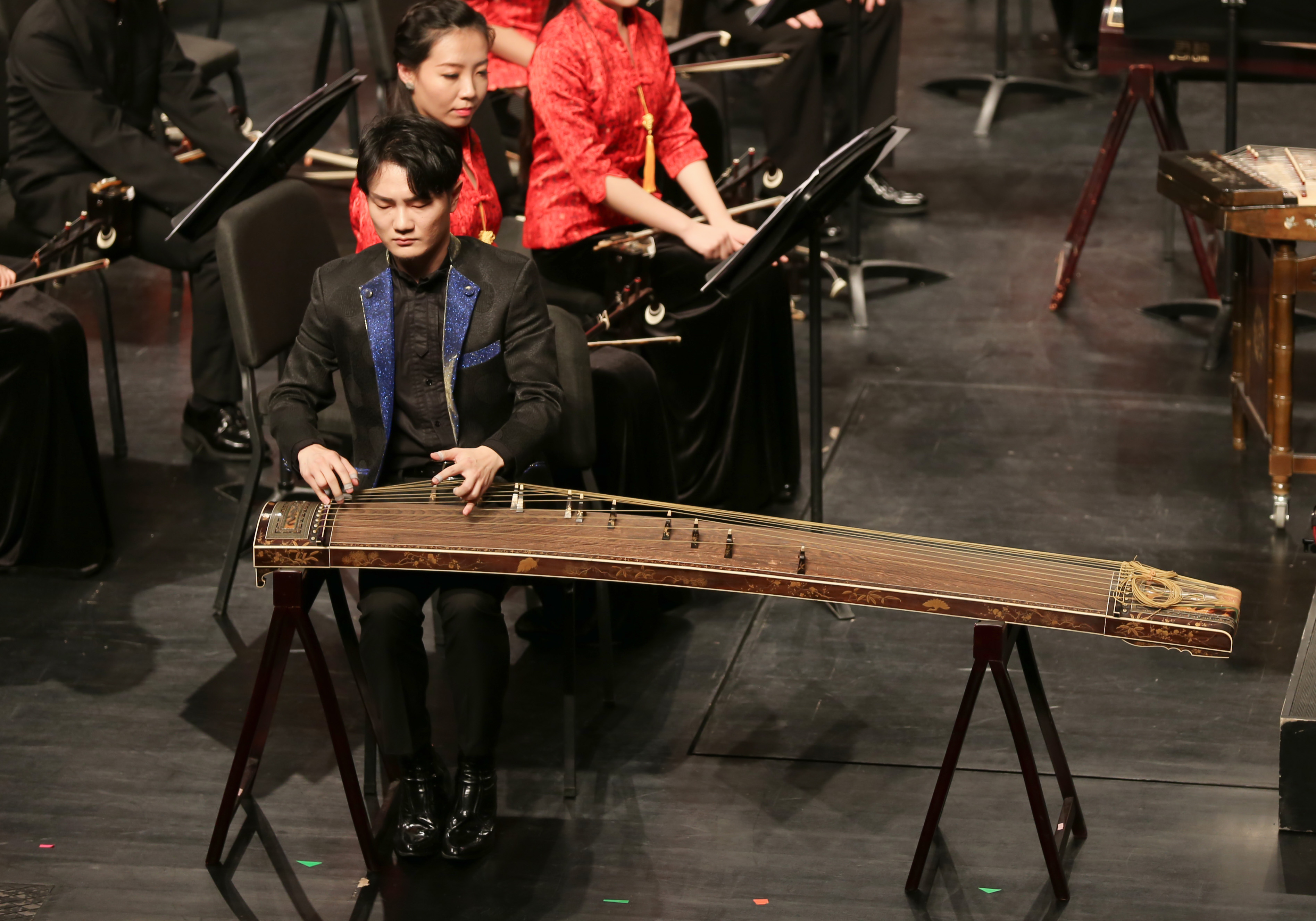 灯光集聚在舞台上,乐队以一曲充满民族特色的《渔舟凯歌》拉开序幕,国乐团一演奏,观众便被这音乐氛围所吸引。《瑶族舞曲》以当地传统歌舞鼓乐为素材创作,在国乐团的演奏下,丰富、生动地展现了瑶族民众欢歌热舞的喜庆场面,表现了能歌善舞的瑶族人民的生活情貌。金钟奖金奖得主刘乐与王琦携手献上古筝二重奏《高山流水》。曲目描绘了流水的各种动态,抒发了志在流水,智者乐水之意,尾声情越的泛音,使人们沉浸于“洋洋乎,诚古调之希声者乎”之思绪中。现场,刘乐还用日本明治时期制作的十三弦筝,演奏了日本民谣《樱花》,静心品听筝的韵味,一副“花如云海似采霞,芬芳无比美如画”的景象浮现脑海。金钟奖优秀奖得主焦点在杨磊的笙伴奏下,演绎了唢呐经典名曲《百鸟朝凤》。曲目以热情欢快的旋律与百鸟和鸣之声,表现了生气勃勃的大自然景象。现场喜悦气氛浓烈,百鸟朝凤般热闹的场景浮现在观众眼帘。