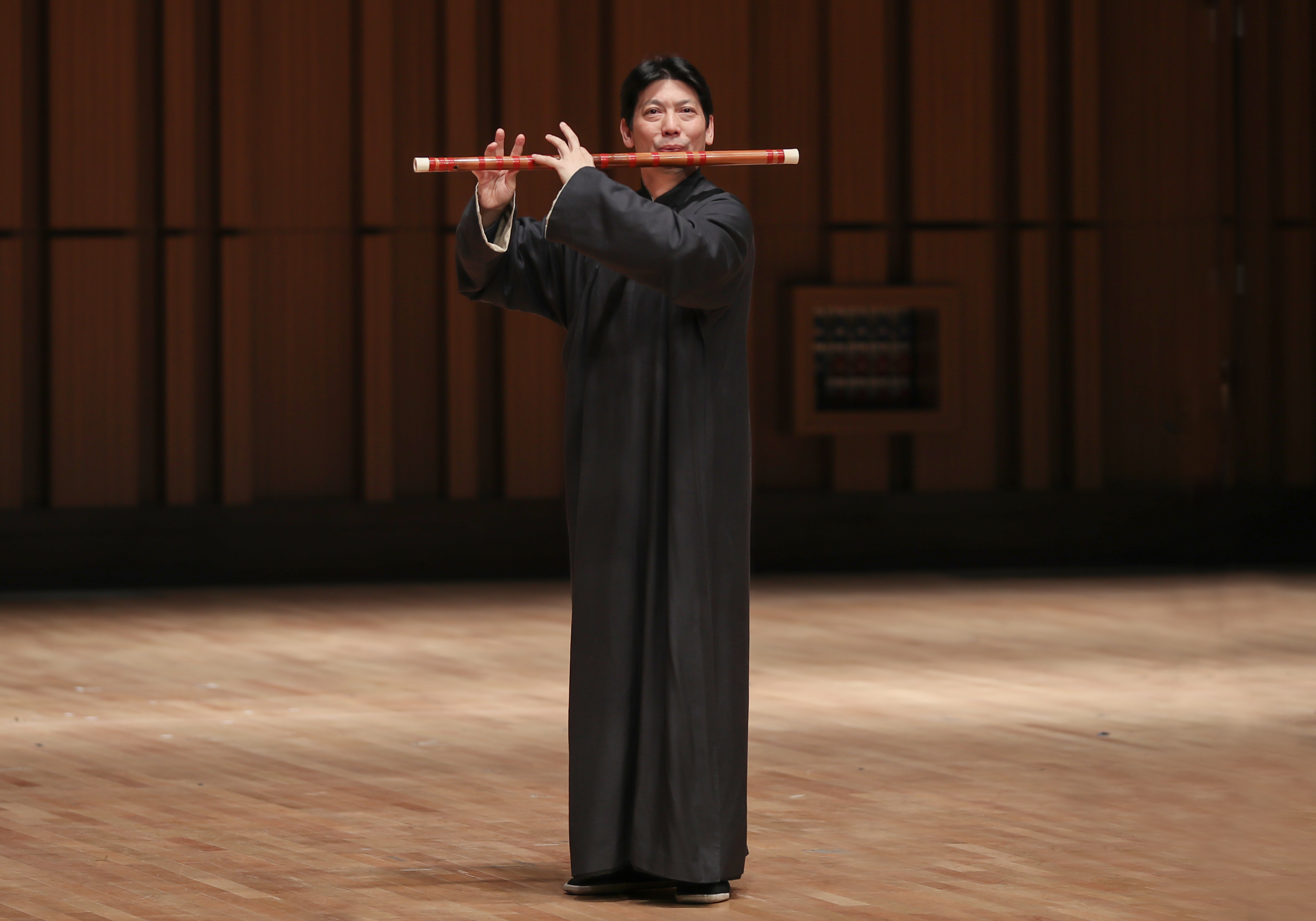 “弦弦掩抑声声思,似诉平生不得志”,章红艳用琵琶演奏《塞上曲》中的<宫怨思春>、<昭君怨>、<湘妃泪>三段,乐曲旋律委婉柔美,表达着王昭君故国的思念,哀怨惆怅、凄楚缠绵。一声弦起,琵琶曲《龙船》将端午节龙舟竞渡的热烈场面生动地描绘出来,琵琶起舞换新声,章红艳用指尖舞动琴弦,激烈如金戈铁马,舒缓如滴滴细雨,以琵琶模拟锣鼓,穿插民间小曲轮番演奏的方法,将欢腾的热闹场面直观地呈现在观众面前。作为南派笛子的代表作品之一,《鹧鸪飞》乐曲讲究神韵,力求以情见形,饶富诗意。杜如松在演奏中,充分发挥曲笛浑厚抒情的特长,通过气息的控制、变化,运用音色、音量得收放变化以及滑音、轻音、打音、叠音等手法,使乐曲忧而不伤,在表面的宁静淡雅中蕴含着丰富的波澜,身未动心已远。《莲台凝香》由杜如松编曲,曲以佛曲《戒定真香》为蓝本,由视觉上的青色莲台化为嗅觉上的莲子清香,暗喻戒定真香,颂扬了莲花“出淤泥而不染,濯清涟而不妖”的君子品格。用洞箫吹奏,观众似坠入深深地禅境之中,杂念慢慢抛却,生命慢慢沉淀,一切都自然而得,那么悠游安然。音乐会上,观众们被杜如松那洞箫声所痴迷,曲终人自醉矣。停顿片刻,现场才响起雷鸣般的掌声。