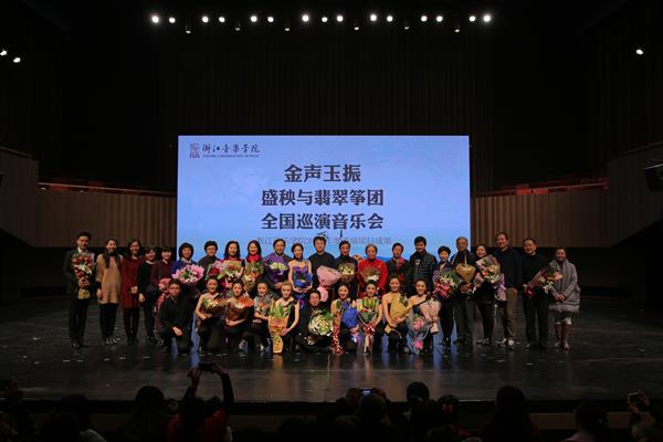 12月23日晚,我院2016年表演项目成果音乐会——盛秧与翡翠筝团全国巡演音乐会(杭州站)在我院音乐厅顺利举行。浙江省委教育工委副书记、省教育厅副厅长鲍学军,浙江音乐家协会主席翁持更,浙派古筝传承人、上海音乐学院古筝教授孙文妍,著名作曲家周煜国,我院党委副书记、副院长张建国等专家领导和一大批古筝爱好者们一起欣赏了这场视听盛宴。