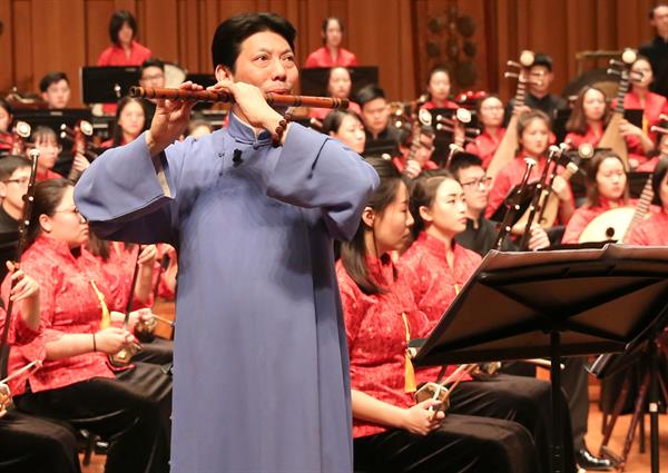 音乐会最大的亮点来自于两位浙派民乐演奏家带来的两部协奏曲。杜如松演奏的《雪意·断桥》(刘锡津曲,2013)充满了“断桥残雪孤山梅”的韵味,两端的慢以D调曲笛奏出“尺调腔”柔美旋律,一板三眼的节拍舒展而不失大气;中段换为G调梆笛,连续的跳吐奏法将加花乐句逐渐推向高潮,又以循环换气的技巧支撑长乐句,取自越剧《白蛇传·断桥》的素材在这里融合得浑然天成。