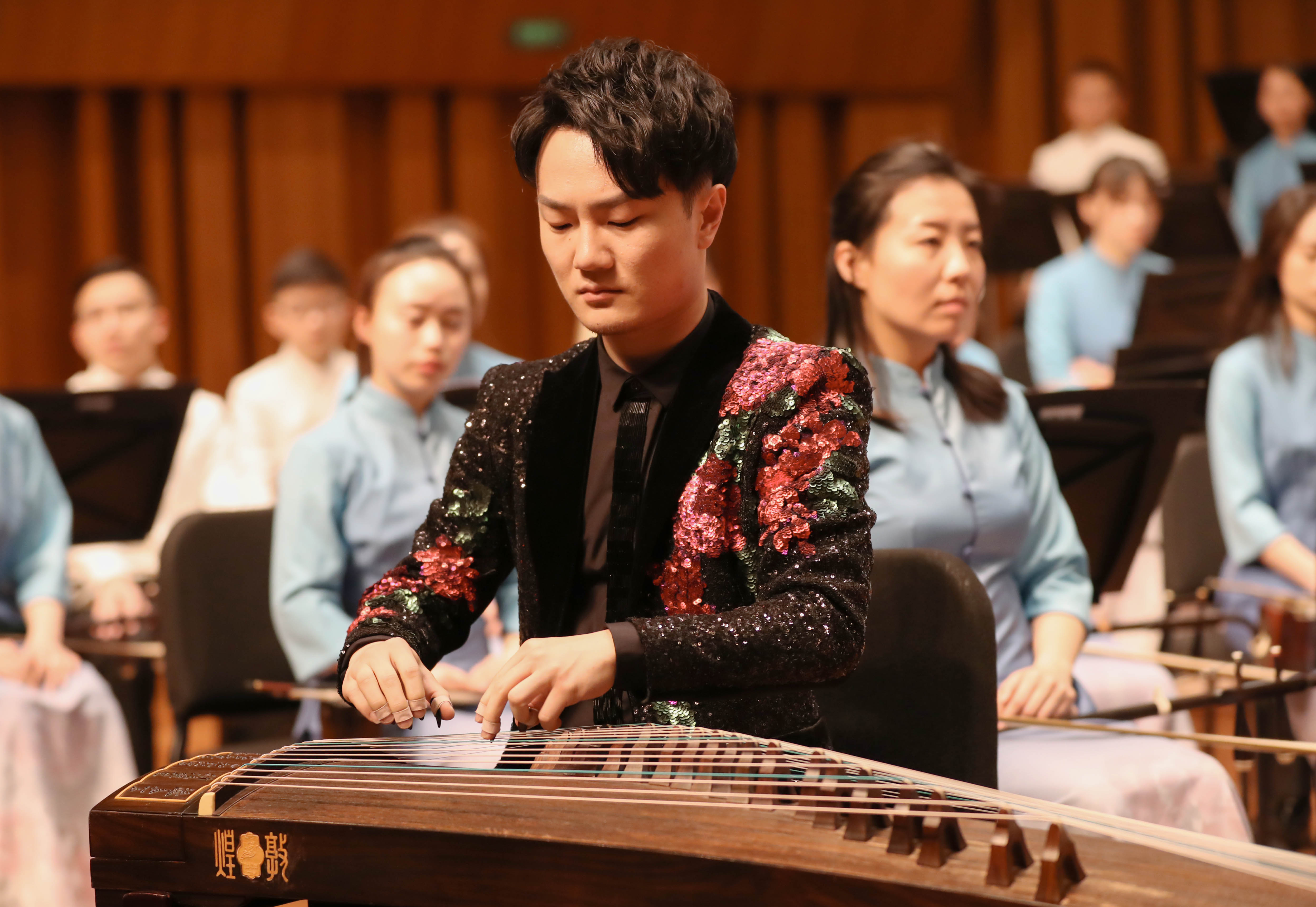 同为新生代艺术家的姜莹所创作的《丝绸之路》是以室内乐《丝路》和《敦煌新语》为基础上延伸出来的民族管弦乐,这一系列融合了世界各地民族音乐元素的作品上演率很高,也预示了如今渐渐成为主流的跨文化作曲方式。自从“一带一路”上升为国家战略以来,近三年涌现了许多“丝路”题材的管弦乐新作,今年马友友和他的丝绸之路乐团斩获格莱美“最佳世界音乐专辑”大奖,对民间音乐的回归和各地域元素的融合已是当代音乐创作的大势所趋。浙音国乐团的各乐器组运用特殊演奏法表现出浓墨重彩的异域风情:从特殊定弦的古筝刮奏出的阿拉伯音阶、贴胶布的G调新笛,琵琶、中阮、弦乐队低音奏出的主导节奏型,胡琴以切分节奏拍击琴筒等等。令人印象深刻的是国乐系教师、唢呐演奏家焦点,在独奏段落中缩小口风控制唢呐的音量,吹奏特征变化音时充分利用连奏和调奏增加了一丝神秘气息。