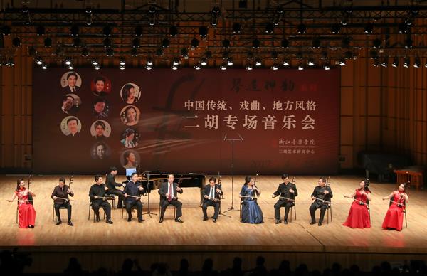 “琴道神韵”系列(二)中国传统、戏曲、地方风格二胡专场音乐会上,当代顶尖的二胡演奏家汇聚一堂,紧紧围绕“传统、戏曲和地方风格”这一主题核心,演奏了囊括不同时期、不同地域和民族风格的15首二胡经典作品,掀起了一阵二胡狂热追星潮,为观众奉献了一场精彩绝伦的二胡艺术盛宴。很多曲目是演奏家成名之作,大师名家们现场亲自演奏,可谓是名家荟萃、本真演绎。“戏曲”风格是本场音乐会的突出亮点。《宝玉哭灵》作为浙江最有代表性的戏曲剧种越剧音乐,二胡演奏家许奕演奏此曲,表达了充满戏剧张力的内心情感,充分体现了二胡艺术声腔化、戏剧化的探索。演出曲目结束后,全场一片沸腾。在听众的强烈要求下,11位著名演奏家又一起返场加演了两首《采茶舞曲》和《赛马》,大师云集的场面彻底将观众的热情带动到极点。《采茶舞曲》极富浙江地方音乐特色,学院“二胡艺术研究中心”的精心选取更加体现了其立足于浙江地方传统音乐特色,回归和发扬地方音乐风格的寻根之旅。音乐会在欢腾热烈的《赛马》齐奏声中完美落幕。