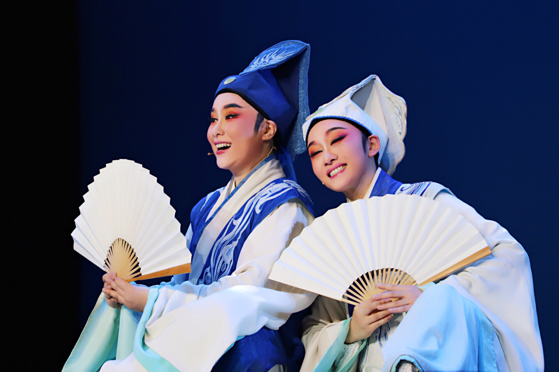 演出在一片热烈掌声中拉开帷幕。绚丽多姿的舞台布景、精致唯美的服装道具和青年演员精湛的艺术表现力让观众们眼前一亮。新版越剧《梁祝》是浙江小百花越剧团为了纪念越剧百年诞辰,在老版越剧《梁祝》的基础上,从文本改编、音乐结构、舞台呈现等方面都做了全面创新,让古老的爱情传说得以重新演绎,同时赋予了更为现代和唯美的色彩。全剧一一展现了那脍炙人口的经典唱段,剧终时刻,梁山伯与祝英台以扇喻蝶,表达真挚而伟大的情感,那种东方式诗意和浪漫为观众带来无限的遐想。