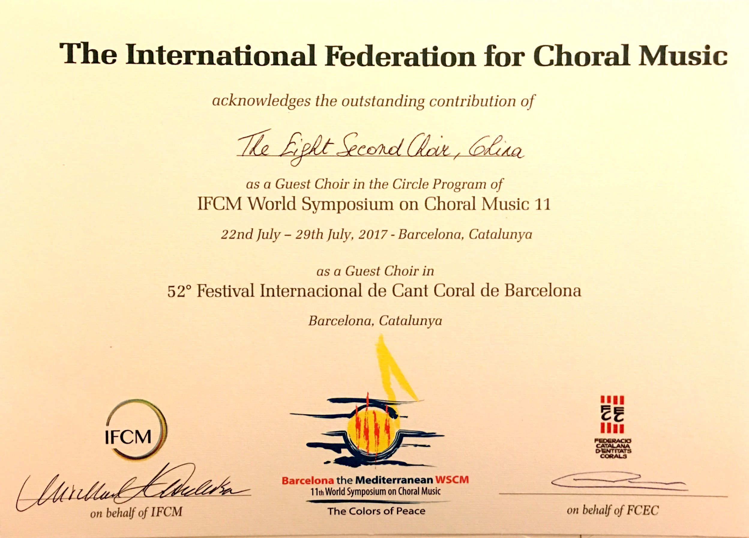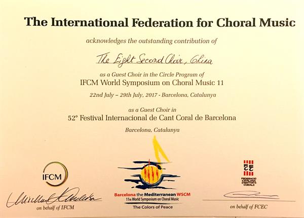 7月22日至29日,第十一届世界合唱研讨会在风景如画的巴塞罗那举行,学院“八秒”合唱团受国际合唱联盟(IFCM)邀请参加盛会。期间,“八秒”合唱团举办的两场合唱音乐会获得巨大成功,在当地引起强烈反响,国际合唱联盟为“八秒”合唱团颁发研讨会参演最高荣誉——“杰出贡献”荣誉证书。