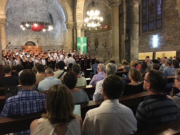 当地时间7月26日晚,第二场展演活动在巴塞罗那最古老的教堂——圣贝雷·德·布埃亚斯教堂举行。本场音乐会,“八秒”合唱团成员与同时受邀的前来展演的加拿大多伦多“VIVA”青年合唱团同台交流展演。在这座历经沧桑的古老建筑里,来自东方亮丽的青春之声和来自西方温雅的安宁之声共同赢得了欢呼和赞美。“八秒”合唱团用传统博大的中华文化开启演唱会的序幕,《江雪》《游子吟》《阿细跳月》《大弄赖娄》将美丽的中国故事在此绽放,向世界展示和谐、灿烂、辉煌的中华文明。