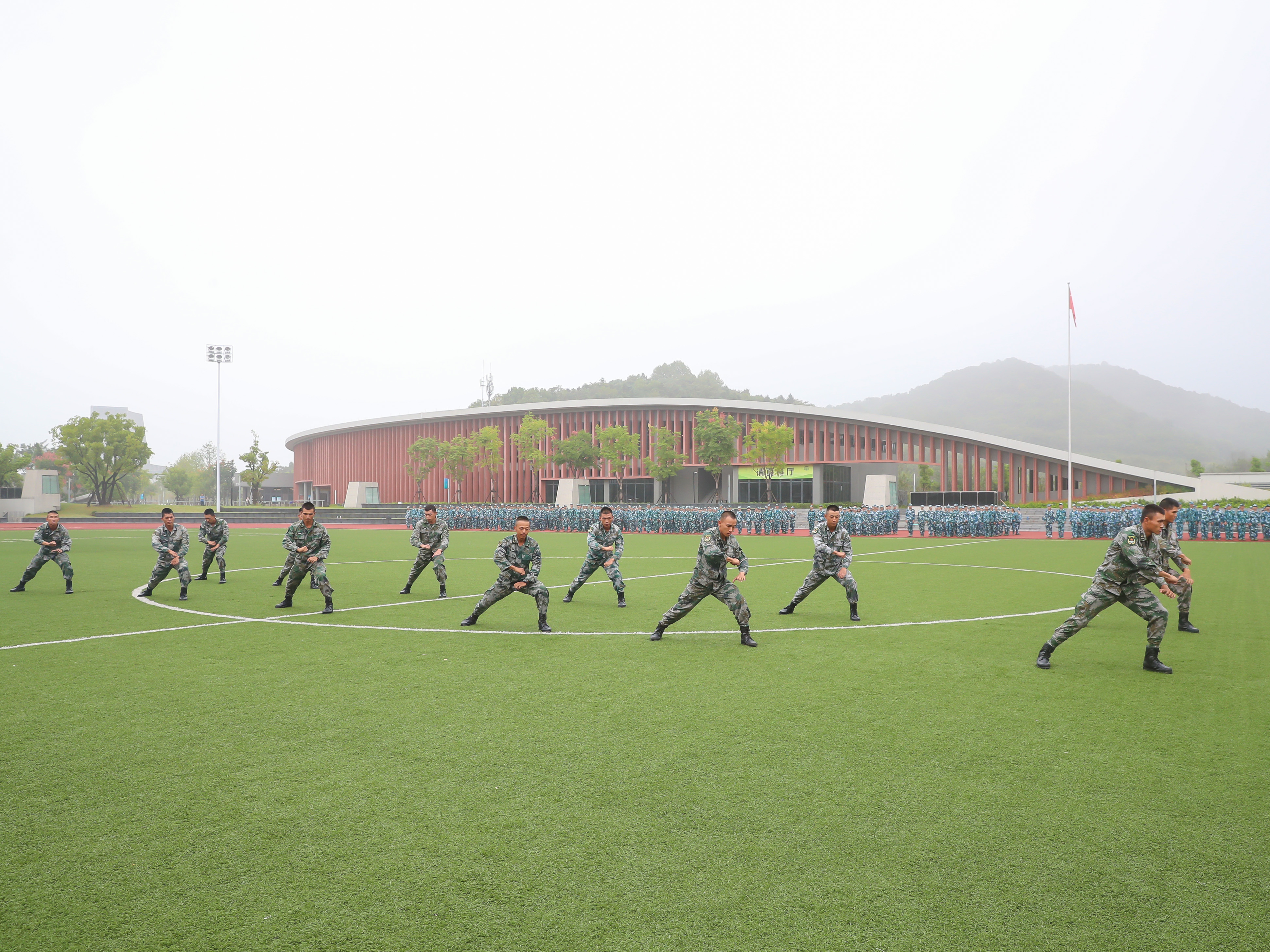 分列式表演正式开始,14个军训排依次走过主席台接受领导的检阅,学生们精神抖擞、动作整齐、口号响亮、步伐铿锵,赢得现场阵阵掌声,展现出浙音新生经过军训洗礼后良好的精神风貌和军事素质。承训教官们还进行了精彩的捕俘拳表演,动作干脆利落,出拳浑然有力,尽显部队男儿的铿锵风采。