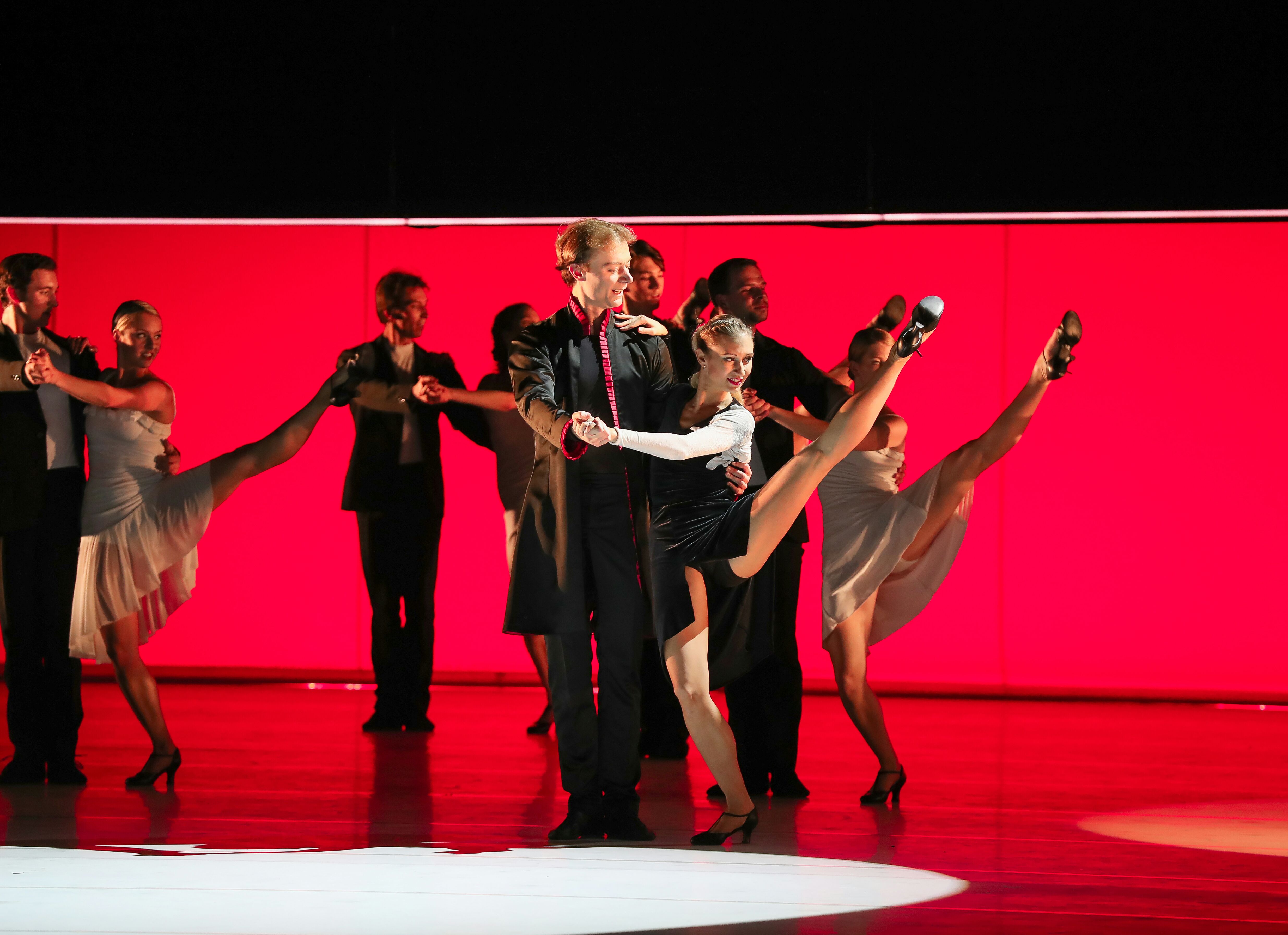 光影交织着,宁静的湖面在舞台地板上流动,光线浮动,掠影斑斑,仿佛有微风吹过,仿佛有阳光照耀。故事在冰冷的白光照耀下开启,男主角Siegfried王子被自己身患绝症的消息击打得痛苦不已,他体内的另一个黑暗的分身出现了,在鲜红的幕布间穿梭,在懊恼的王子心头,注入迷茫扰乱人心的墨色。场景切换,各色男女正旋转着肆意的舞步,在热闹的灯光下,在热烈的节奏里,绽放着与王子格格不入的欢雀。他们时而统一时而凌乱的步伐,在配乐的烘托下,在光圈的舞动中,张扬地充满了整个舞台。与古典舞剧不同,这部《黑与白》处处展现着革新和创意。没有芭蕾纱裙的裙摆,没有天鹅洁白的羽毛,没有王子笔挺的制服,有得只是出其不意的舞步、撕心裂肺的斗争和迷茫挣扎的内心独白。舞台上投影出的镜像恍惚斑驳,像极了王子恍惚的精神状态,迷惑着人们的心扉。