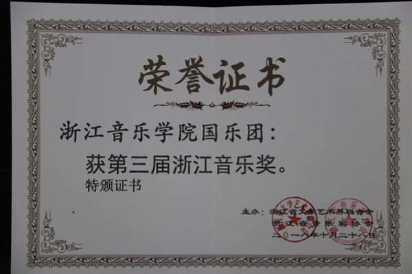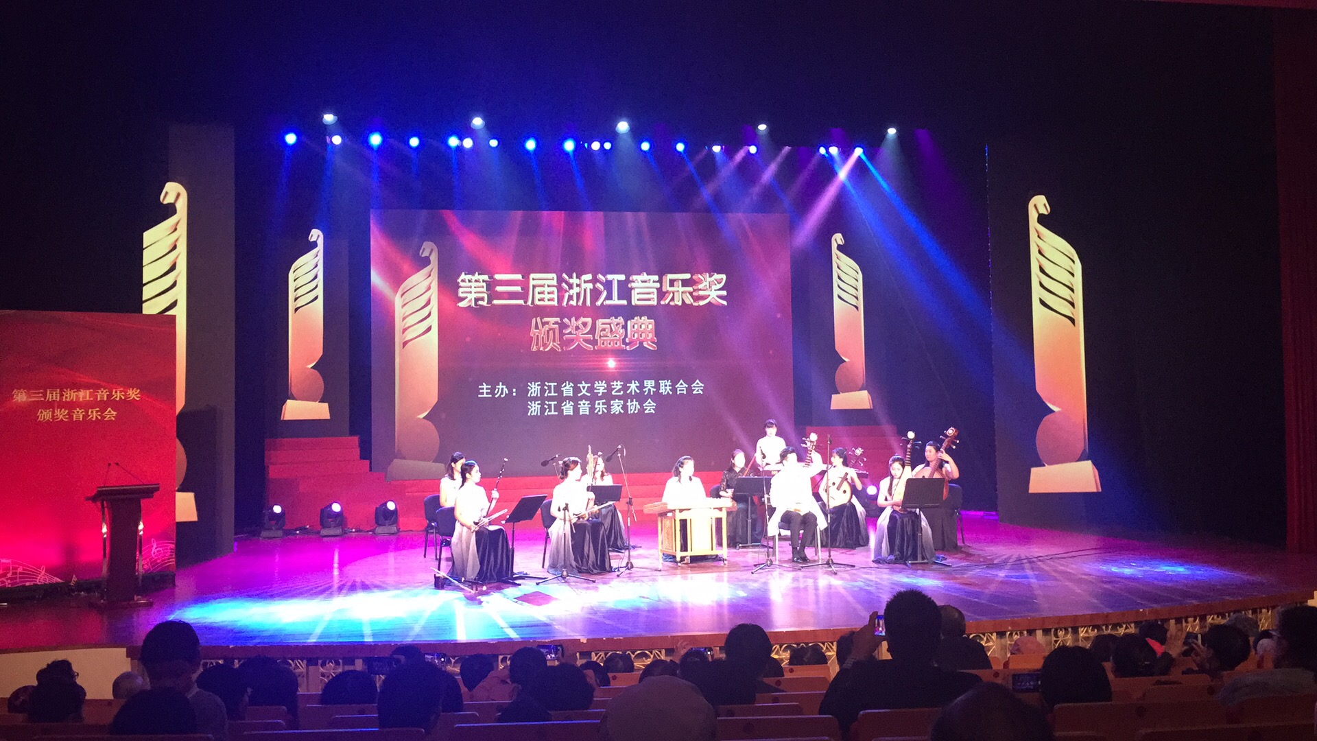 10月28日晚,“第三届浙江音乐奖”颁奖盛典在浙江音乐厅隆重举行。我院国乐团荣获第三届“浙江音乐奖”,共有2个团体、3位个人获此殊荣。该奖项每两年评选一届,每届获奖名额为3-8名。颁奖盛典上国乐团作为获奖团体演绎了《欢乐歌》《敦煌》两首作品。