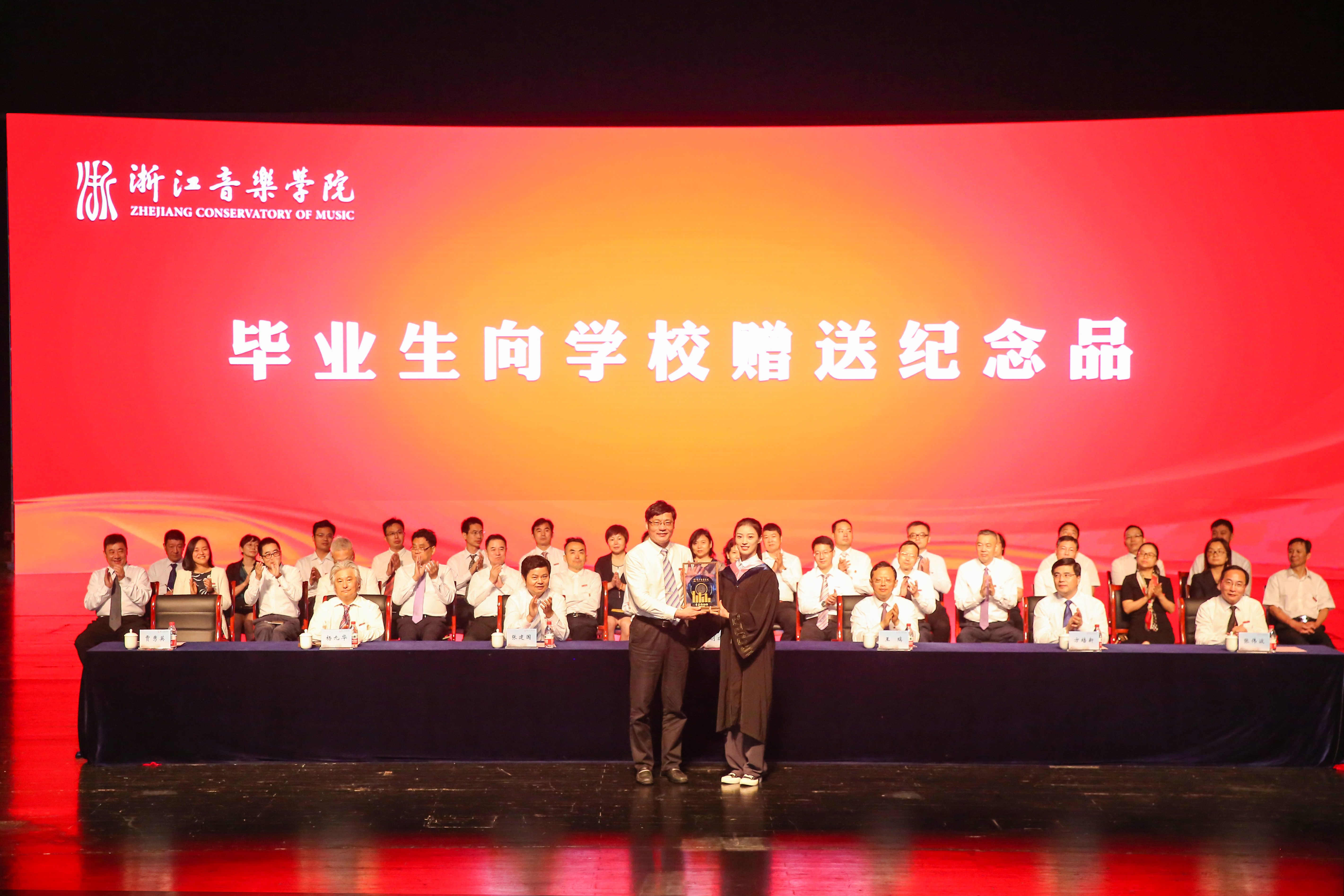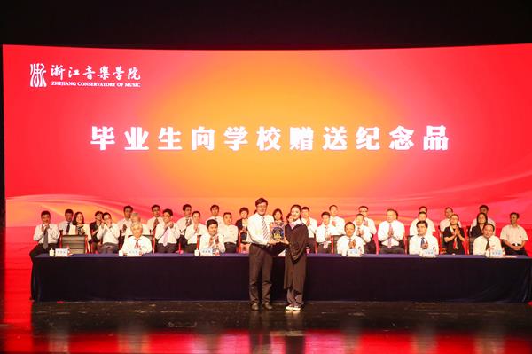 学院党委书记胡建新代表学校现场接受了毕业生赠送给母校的纪念品,一张特别的CD光盘汇集了同学们在校学习期间创作的作品。毕业生代表上台接受了学院为毕业生精心设计、定制的“事必尽善”纪念章,小小水晶章饱含母校情、师生谊,寄托母校对毕业生的衷心祝愿和殷切希望。