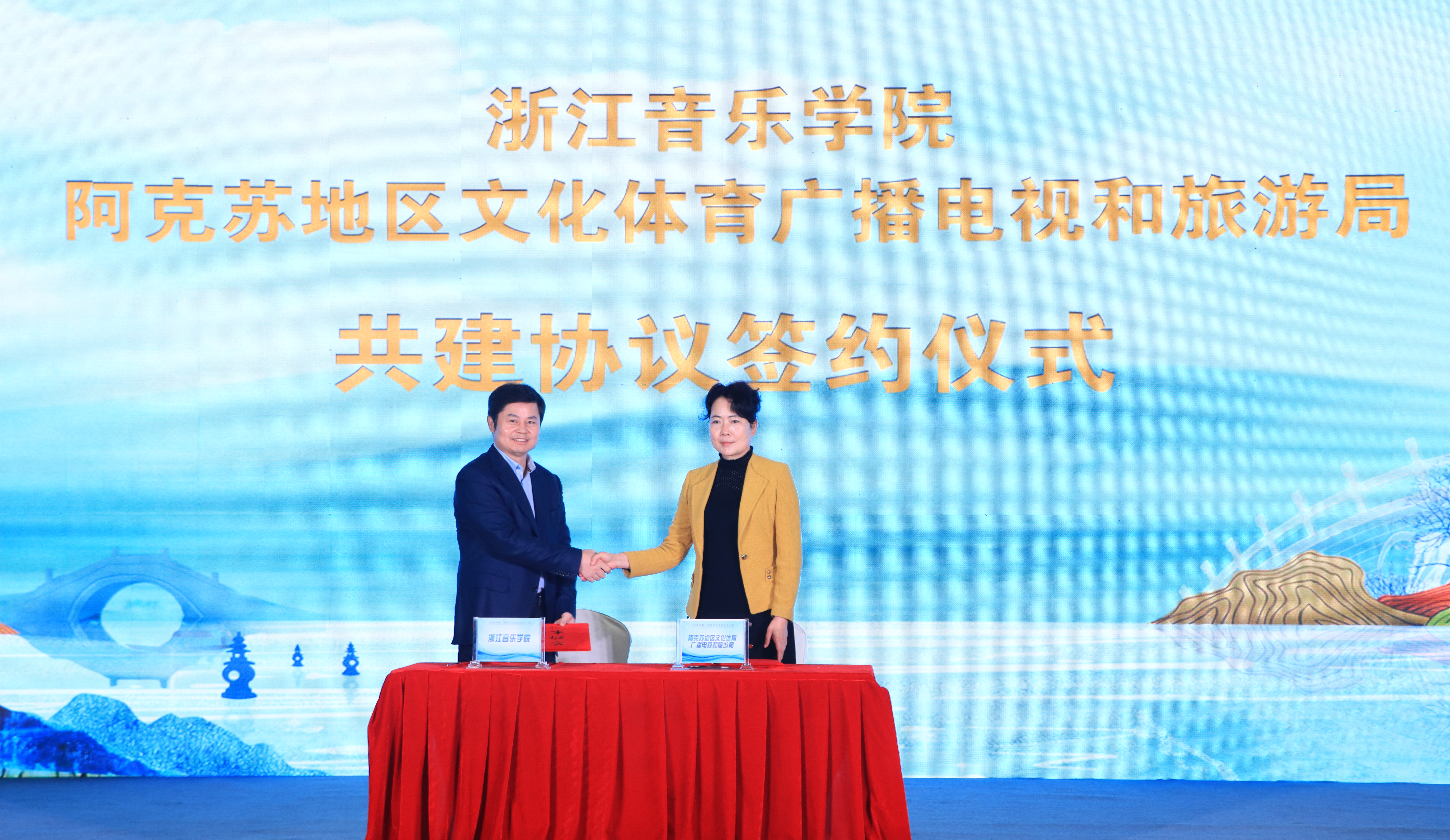 1020日上午,由浙江省文化和旅游厅联合中共阿克苏地委、阿克苏地区行署、浙江省援疆指挥部共同举办的浙阿文化交流合作工程启动仪式在新疆阿克苏地区文博院隆重举行。学校党委副书记、副院长张建国带队参加,与阿克苏地区文化体育广播电视和旅游局党组书记王新春共同签署战略合作共建协议,并授牌阿克苏地区塔里木歌舞团韵律浙疆工作室”“创作采风基地。