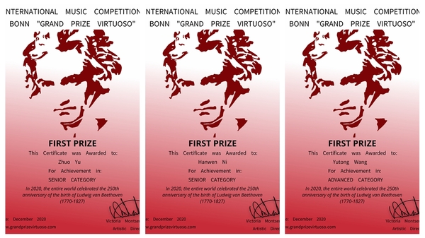 据悉,德国国际音乐比赛“优秀演奏家大奖赛”由法国、德国、奥地利有关单位联袂主办,分设管乐、弦乐、钢琴、声乐和室内乐等比赛项目,评委会成员均为全球著名演奏家,来自世界各国的专业演奏者参与其中、角逐大奖。比赛结束后,获奖者将受邀在欧洲著名音乐厅举行专场音乐会或开展欧洲巡演。今年,为纪念贝多芬诞辰250周年,获奖者将于12月9日至11日,受邀在德国波恩贝多芬故居进行首演。