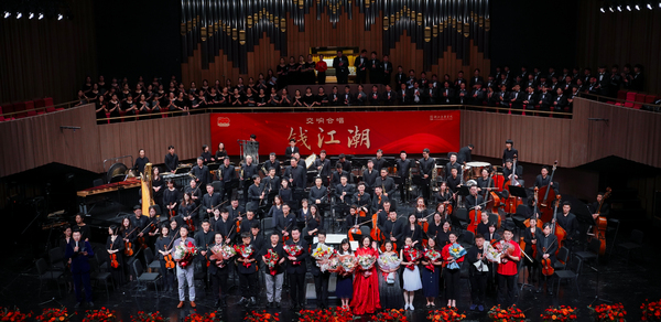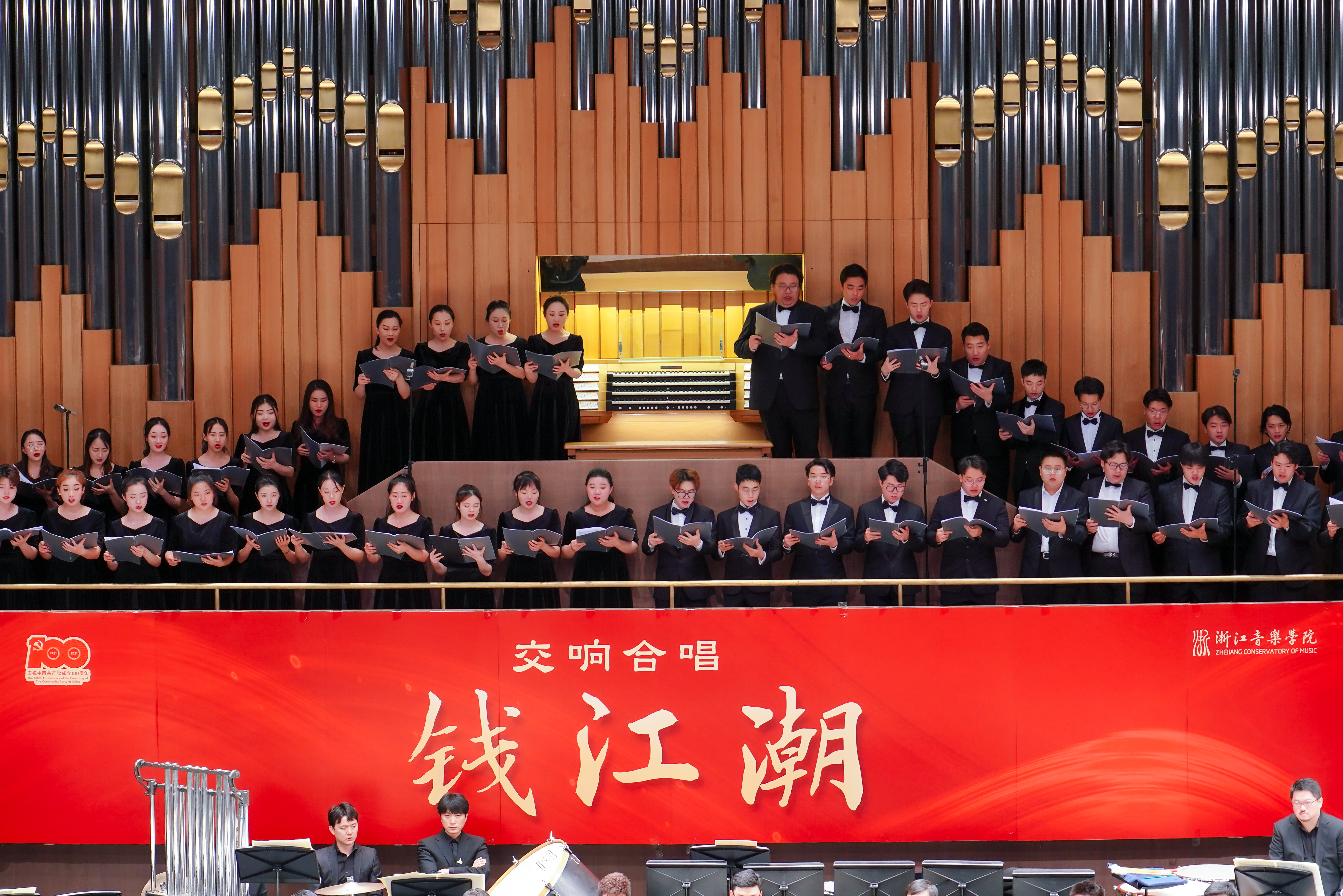 5月28日晚,学院为庆祝中国共产党成立100周年而倾力打造的原创音乐作品——大型交响合唱《钱江潮》在周颖音乐厅精彩上演。学院师生联合杭州爱乐乐团,立足钱江大地百年潮涌,为广大观众合力奉上了一场视觉与听觉的双重盛宴。学院党政领导班子成员胡建新、王瑞、贾秀英、杨九华、张伟波、李俊等与师生代表共400余人观看了演出。