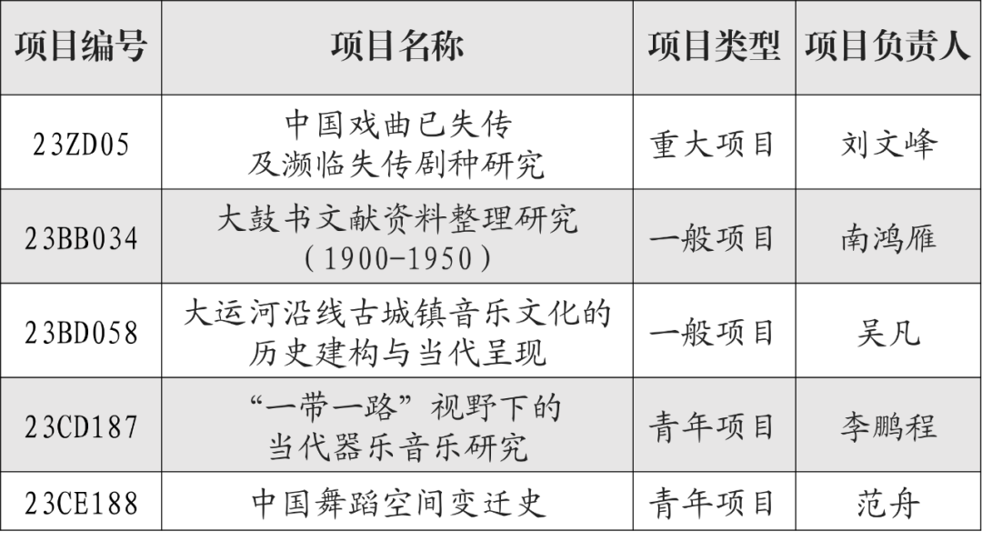 近日,全国艺术科学规划领导小组办公室公布了2023年度国家社科基金艺术学项目立项名单,我校4个项目获批2023年度国家社科基金艺术学项目。其中,《中国戏曲已失传及濒临失传剧种研究 》(项目负责人:刘文峰 ) 获批重大项目,《大鼓书文献资料整理研究(1900-1950) 》(项目负责人:南鸿雁) 、《大运河沿线古城镇音乐文化的历史建构与当代呈现》(项目负责人:吴凡)获批一般项目 、《“一带一路”视野下的当代器乐音乐研究》(项目负责人:李鹏程) 、《中国舞蹈空间变迁史 》(项目负责人:范舟) 获批青年项目。