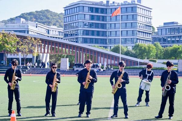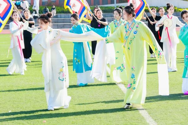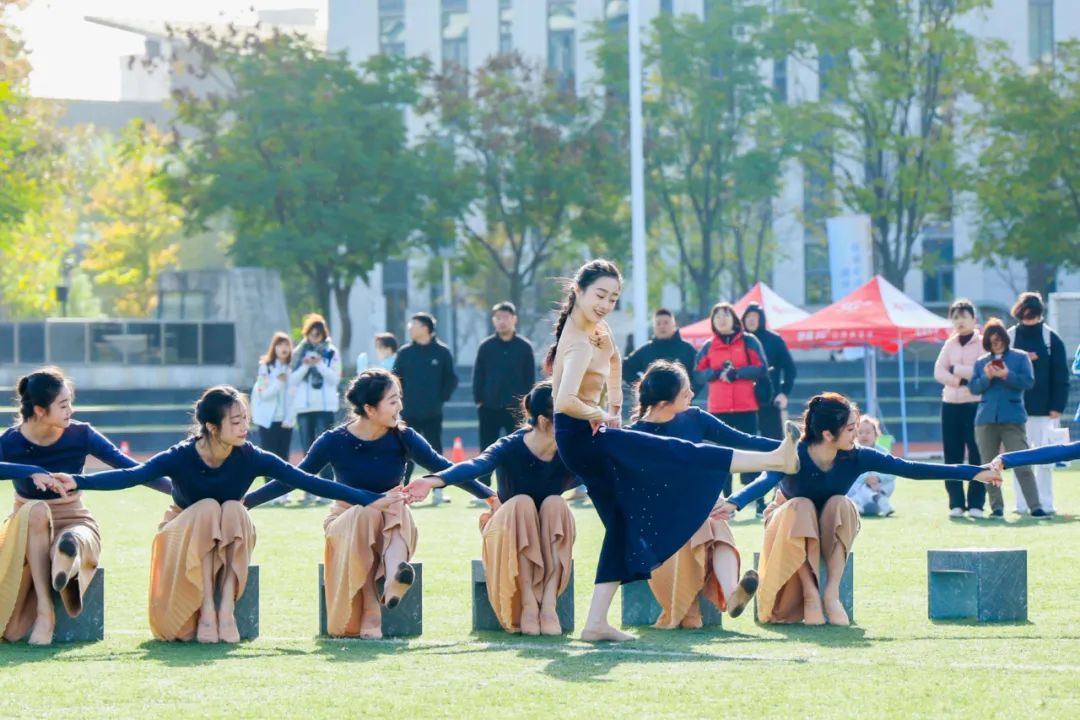 随后,开幕式演出精彩开场。国乐系带来了现代筝乐作品《星光之恋》,传统古筝演奏技法与现代音乐元素完美结合,奏响了当代大学生的青春节奏与励志音符。舞蹈学院春晚原班人马在秋日操场再跳《碇步桥》,“SaSa”女孩们重现经典,带我们走入溪水淙淙的诗画江南。流行音乐系带来唱跳作品《无尽之羽》和流行演奏《Kyddo(奇多)》,充满律动又个性张扬的演出,展现了当代青年不惧挑战、坚持自我的澎湃激情。戏剧系带来了风格迥异的传统越剧与歌舞《the greatest show》表演,温婉翩然的传统艺术与热情四射的音乐剧表演高潮迭起,令人目不暇接,仿佛一场跨越时空的艺术盛宴。
