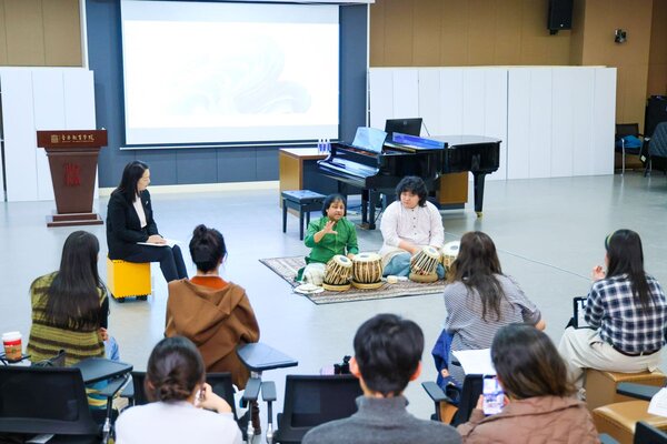 Bivakar Choudhury教授带来的印度塔布拉鼓工作坊同样精彩。他从印度塔布拉鼓的由来讲起——羊皮蒙面、双音变幻,娓娓道出鼓乐与信仰的千年渊源。随后,他讲述了印度音乐中独具魅力的“汀塔拉”节奏,引领学员步入那片色彩斑斓、充满异域风景的韵律秘境。在互动环节,他带领学生尝试击打出陌生却迷人的节拍,仿佛跟随时光的驼铃,踏上了一场穿越丝路的音乐之旅。“这个工作坊像一场文化的探险,让我们在节奏的缝隙中,聆听不一样的东方智慧,感受音乐与天地的共鸣回响。”